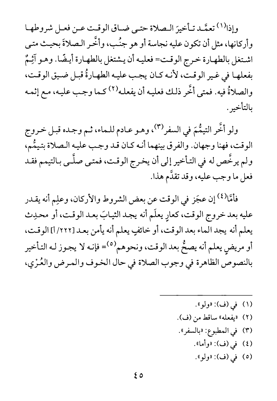 فأمَّا (¬٤) إن عجَز في الوقت عن بعض الشروط والأركان، وعلِم أنه يقدر عليه بعد خروج الوقت، كعارٍ يعلَم أنه يجد الثيابَ بعد الوقت، أو محدِث يعلم أنه يجد الماء بعد الوقت، أو خائفٍ يعلم أنه يأمن بعد [٢٢٢/أ] الوقت، أو مريضٍ يعلم أنه يصحُّ بعد الوقت، ونحوهم (¬٥) = فإنه لا يجوز له التأخير بالنصوص الظاهرة في وجوب الصلاة في حال الخوف والمرض والعُرْي،