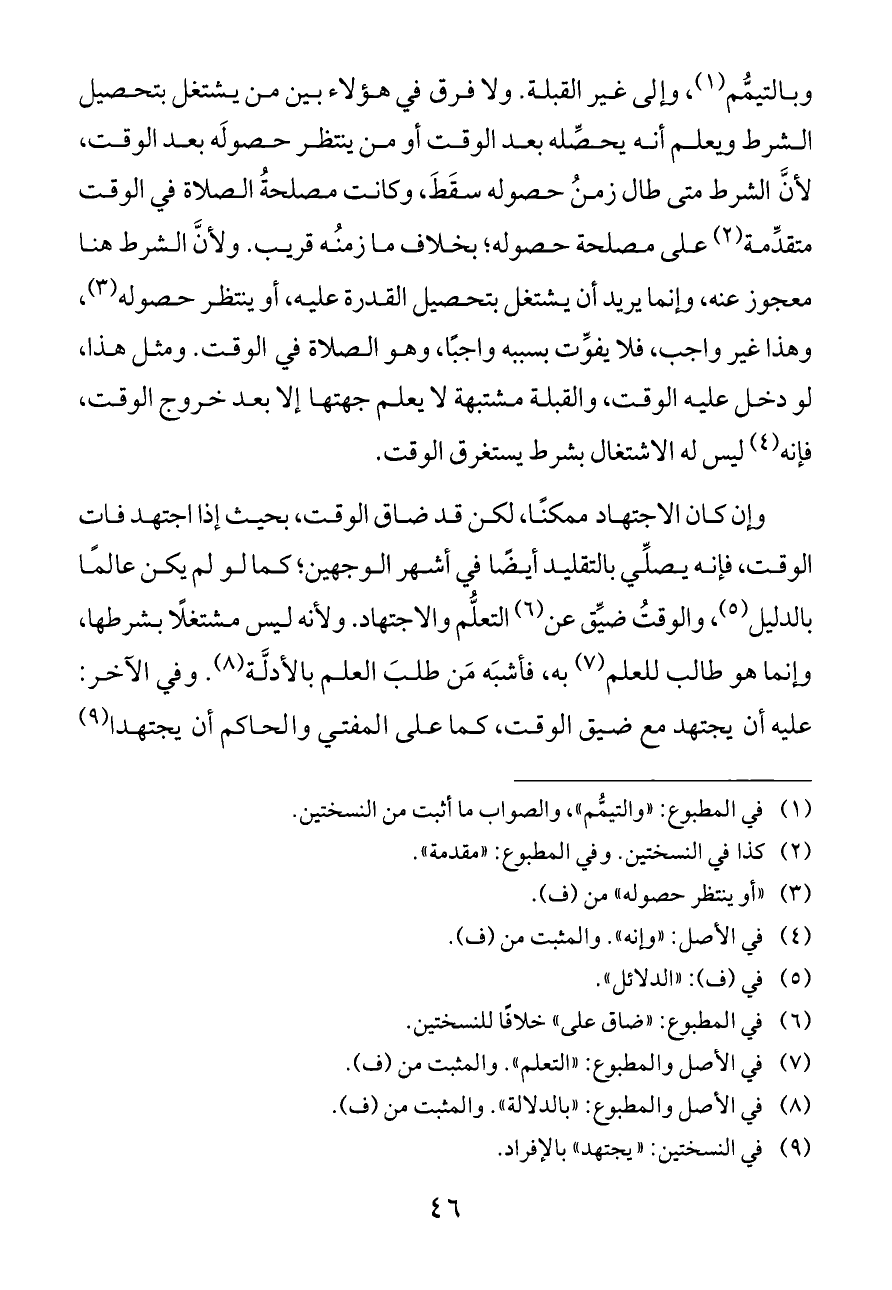 وبالتيمُّم (¬١)، وإلى غير القبلة. ولا فرق في هؤلاء بين من يشتغل بتحصيل الشرط ويعلم أنه يحصِّله بعد الوقت أو من ينتظر حصولَه بعد الوقت، لأنَّ الشرط متى طال زمنُ حصوله سقَطَ، وكانت مصلحةُ الصلاة في الوقت متقدِّمة (¬٢) على مصلحة حصوله؛ بخلاف ما زمنُه قريب. ولأنَّ الشرط هنا معجوز عنه، وإنما يريد أن يشتغل بتحصيل القدرة عليه، أو ينتظر حصوله (¬٣)، وهذا غير واجب، فلا يفوِّت بسببه واجبًا، وهو الصلاة في الوقت. ومثل هذا، لو دخل عليه الوقت، والقبلة مشتبهة لا يعلم جهتها إلا بعد خروج الوقت، فإنه (¬٤) ليس له الاشتغال بشرط يستغرق الوقت.