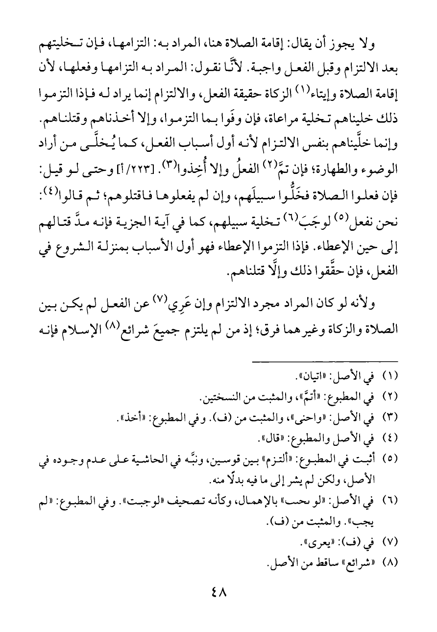 ولا يجوز أن يقال: إقامة الصلاة هنا، المراد به: التزامها، فإن تخليتهم بعد الالتزام وقبل الفعل واجبة. لأنَّا نقول: المراد به التزامها وفعلها، لأن إقامة الصلاة وإيتاء (¬١) الزكاة حقيقة الفعل، والالتزام إنما يراد له فإذا التزموا ذلك خليناهم تخلية مراعاة، فإن وفَوا بما التزموا، وإلا أخذناهم وقتلناهم. وإنما خلَّيناهم بنفس الالتزام لأنه أول أسباب الفعل، كما يُخلَّى من أراد الوضوء والطهارة؛ فإن تمَّ (¬٢) الفعلُ وإلا أُخِذوا (¬٣). [٢٢٣/أ] وحتى لو قيل: فإن فعلوا الصلاة فخَلُّوا سبيلَهم، وإن لم يفعلوها فاقتلوهم؛ ثم قالوا (¬٤): نحن نفعل (¬٥) لوجَبَ (¬٦) تخلية سبيلهم، كما في آية الجزية فإنه مدَّ قتالهم إلى حين الإعطاء. فإذا التزموا الإعطاء فهو أول الأسباب بمنزلة الشروع في الفعل، فإن حقَّقوا ذلك وإلَّا قتلناهم.