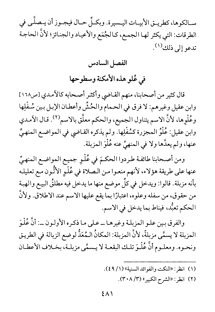 قال كثير من أصحابنا، منهم القاضي وأكثر أصحابه كالآمدي [ص ١٦٨] وابن عقيل وغيرهم: لا فرق في الحمام والحُشِّ وأعطان الإبل بين سُفْلِها وعُلْوِها، لأنَّ الاسم يتناول الجميع، والحكم معلَّق بالاسم (¬٢). قال الآمدي وابن عقيل: عُلْوُ المجزرة كسُفْلِها. ولم يذكره القاضي في المواضع المنهيِّ عنها، ولم يعدَّها ولا في المنهيِّ عنه عُلْوَ المزبلة.