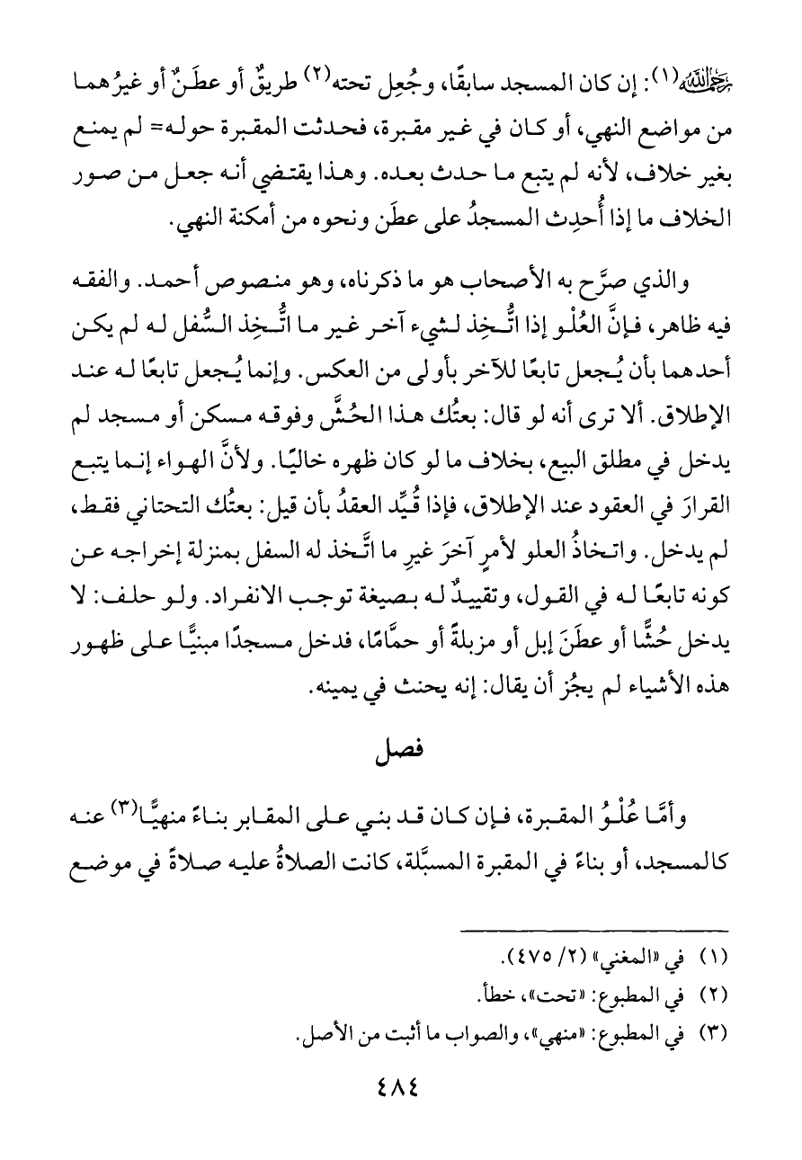 - رحمه الله - (¬١): إن كان المسجد سابقًا، وجُعِل تحته (¬٢) طريقٌ أو عطَنٌ أو غيرُهما من مواضع النهي، أو كان في غير مقبرة، فحدثت المقبرة حوله= لم يمنع بغير خلاف، لأنه لم يتبع ما حدث بعده. وهذا يقتضي أنه جعل من صور الخلاف ما إذا أُحدِث المسجدُ على عطَن ونحوه من أمكنة النهي.