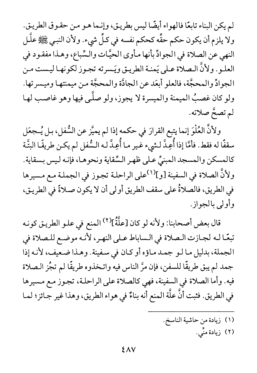 قال بعض أصحابنا: ولأنه لو كان [علَّةُ] (¬٢) المنع في علو الطريق كونه تبعًا له لجازت الصلاة في الساباط على النهر، لأنه موضع للصلاة في الجملة، بدليل ما لو جمد ماؤه أو كان في سفينة. وهذا ضعيف، لأنه إذا جمد لم يبق طريقًا للسفن، فإن مرَّ الناس فيه واتخذوه طريقًا لم تجُز الصلاة فيه. وأما الصلاة في السفينة، فهي كالصلاة على الراحلة، تجوز مع مسيرها في الطريق. فثبت أنَّ علَّة المنع أنه بناءٌ في هواء الطريق، وهذا غير جائز؛ لما