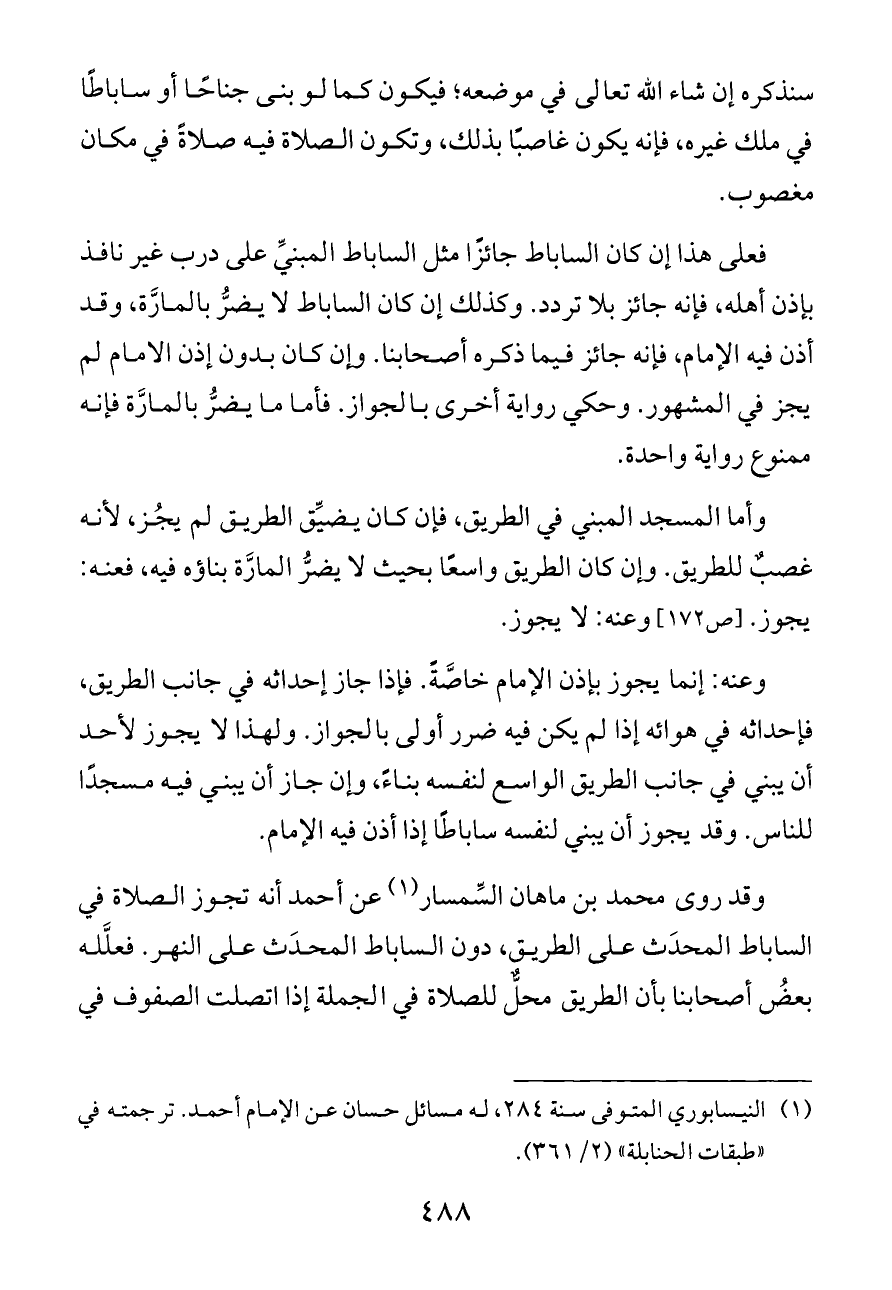 وقد روى محمد بن ماهان السِّمسار (¬١) عن أحمد أنه تجوز الصلاة في الساباط المحدَث على الطريق، دون الساباط المحدَث على النهر. فعلَّله بعضُ أصحابنا بأن الطريق محلٌّ للصلاة في الجملة إذا اتصلت الصفوف في
