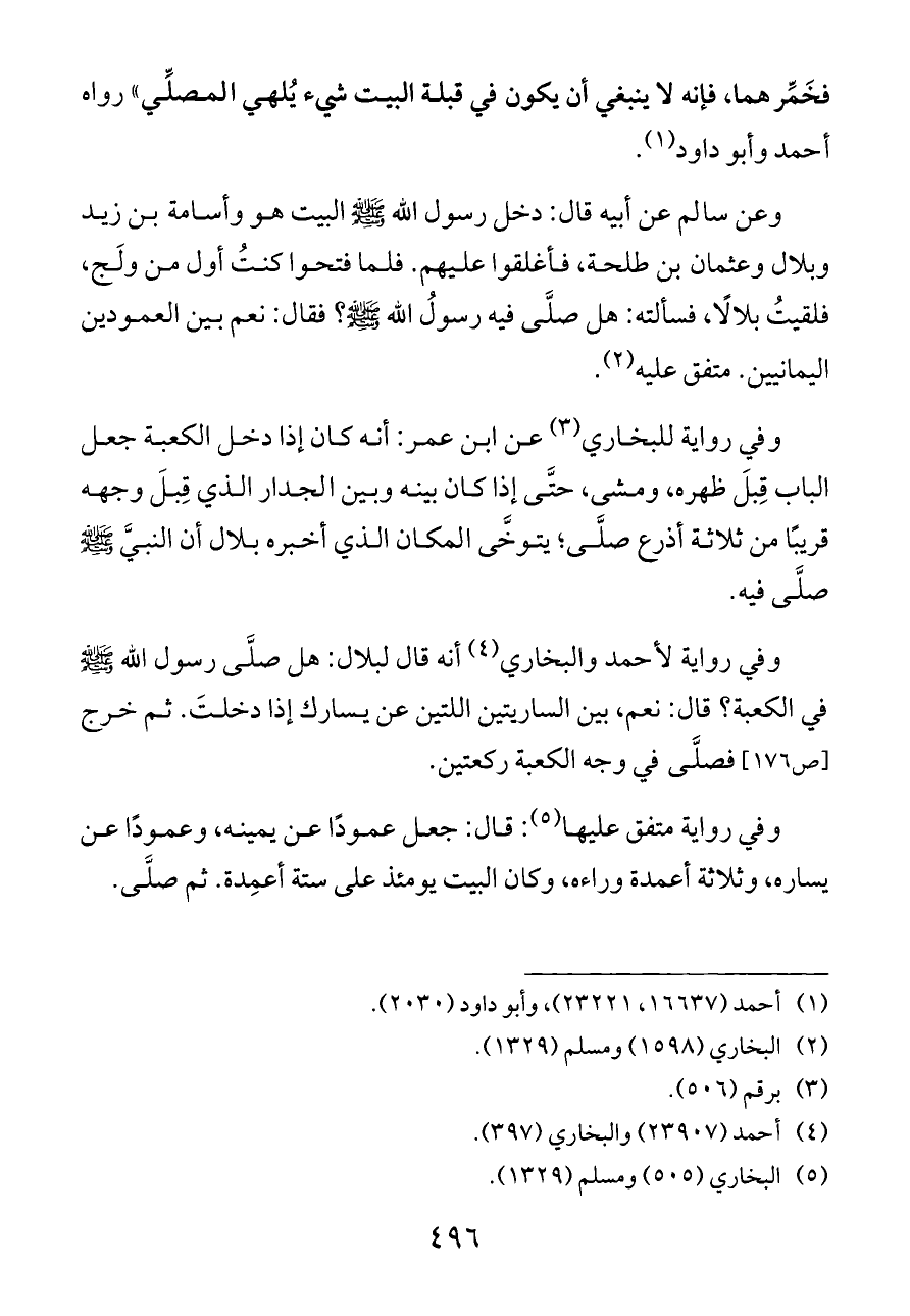 وفي رواية متفق عليها (¬٥): قال: جعل عمودًا عن يمينه، وعمودًا عن يساره، وثلاثة أعمدة وراءه، وكان البيت يومئذ على ستة أعمِدة. ثم صلَّى.