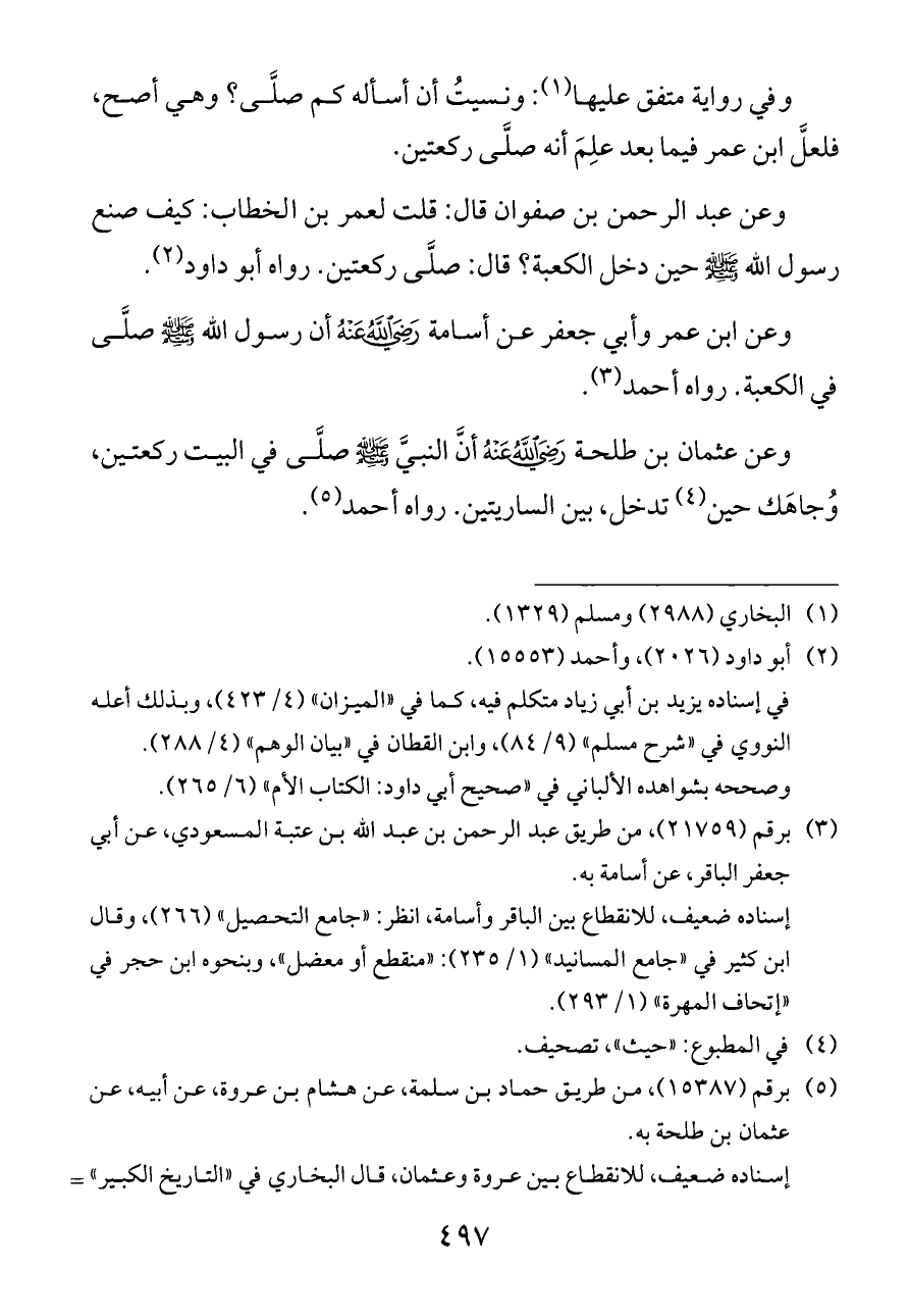 وعن عثمان بن طلحة - رضي الله عنه - أنَّ النبيَّ - صلى الله عليه وسلم - صلَّى في البيت ركعتين، وُجاهَك حين (¬٤) تدخل، بين الساريتين. رواه أحمد (¬٥).