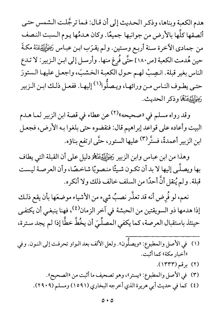 وهذا من ابن عباس وابن الزبير - رضي الله عنهم - دليل على أن القبلة التي يطاف بها ويصلَّى إليها لا بد أن تكون شيئًا منصوبًا شاخصًا، وأن العرصة ليست قبلة. ولم يُنقل أنَّ أحدًا من السلف خالف ذلك ولا أنكره.