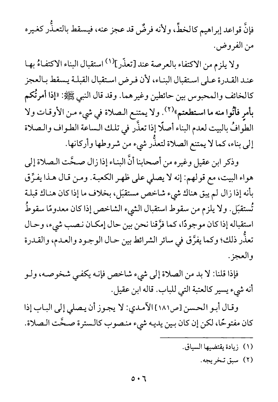 ولا يلزم من الاكتفاء بالعرصة عند [تعذّر] (¬١) استقبال البناء الاكتفاءُ بها عند القدرة على استقبال البناء، لأن فرض استقبال القبلة يسقط بالعجز كالخائف والمحبوس بين حائطين وغيرهما. وقد قال النبي - صلى الله عليه وسلم -: «إذا أمرتُكم بأمرٍ فأتُوا منه ما استطعتم» (¬٢). ولا يمتنع الصلاة في شيء من الأوقات ولا الطوافُ بالبيت لعدم البناء أصلًا إذا تعذَّر في تلك الساعة الطواف والصلاة إلى بناء، كما لا يمتنع الصلاة لتعذُّر شيء من شروطها وأركانها.