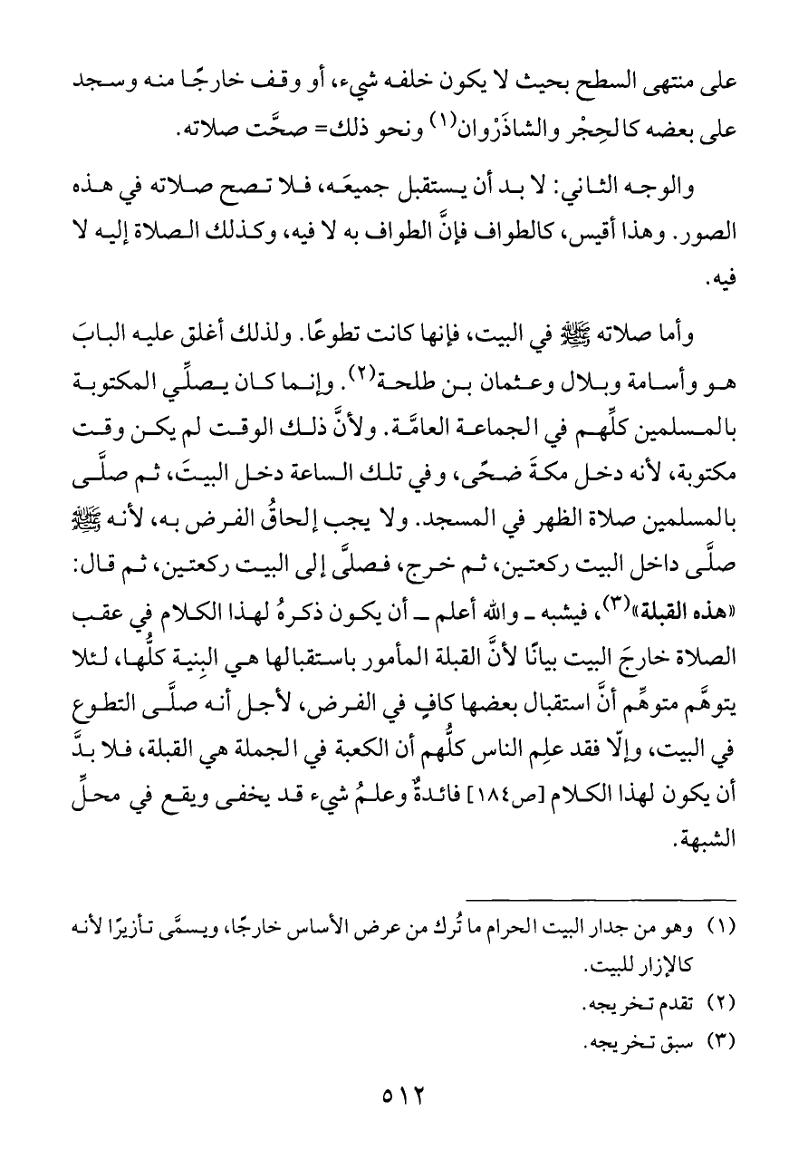 وأما صلاته - صلى الله عليه وسلم - في البيت، فإنها كانت تطوعًا. ولذلك أغلق عليه البابَ هو وأسامة وبلال وعثمان بن طلحة (¬٢). وإنما كان يصلِّي المكتوبة بالمسلمين كلِّهم في الجماعة العامَّة. ولأنَّ ذلك الوقت لم يكن وقت مكتوبة، لأنه دخل مكةَ ضحًى، وفي تلك الساعة دخل البيتَ، ثم صلَّى بالمسلمين صلاة الظهر في المسجد. ولا يجب إلحاقُ الفرض به، لأنه - صلى الله عليه وسلم - صلَّى داخل البيت ركعتين، ثم خرج، فصلَّى إلى البيت ركعتين، ثم قال: «هذه القبلة» (¬٣)، فيشبه ــ والله أعلم ــ أن يكون ذكرهُ لهذا الكلام في عقب الصلاة خارجَ البيت بيانًا لأنَّ القبلة المأمور باستقبالها هي البِنية كلُّها، لئلا يتوهَّم متوهِّم أنَّ استقبال بعضها كافٍ في الفرض، لأجل أنه صلَّى التطوع في البيت، وإلّا فقد علِم الناس كلُّهم أن الكعبة في الجملة هي القبلة، فلا بدَّ أن يكون لهذا الكلام [ص ١٨٤] فائدةٌ وعلمُ شيء قد يخفى ويقع في محلِّ الشبهة.