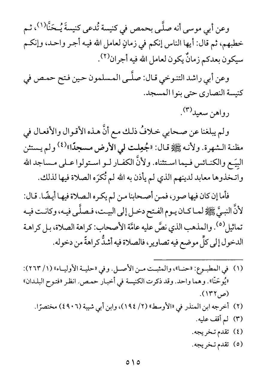 وعن أبي موسى أنه صلَّى بحمص في كنيسة تُدعى كنيسةَ يُحَنَّا (¬١)، ثم خطبهم، ثم قال: أيها الناس إنكم في زمانٍ لعامل الله فيه أجر واحد، وإنكم سيكون بعدكم زمانٌ يكون لعامل الله فيه أجران (¬٢).