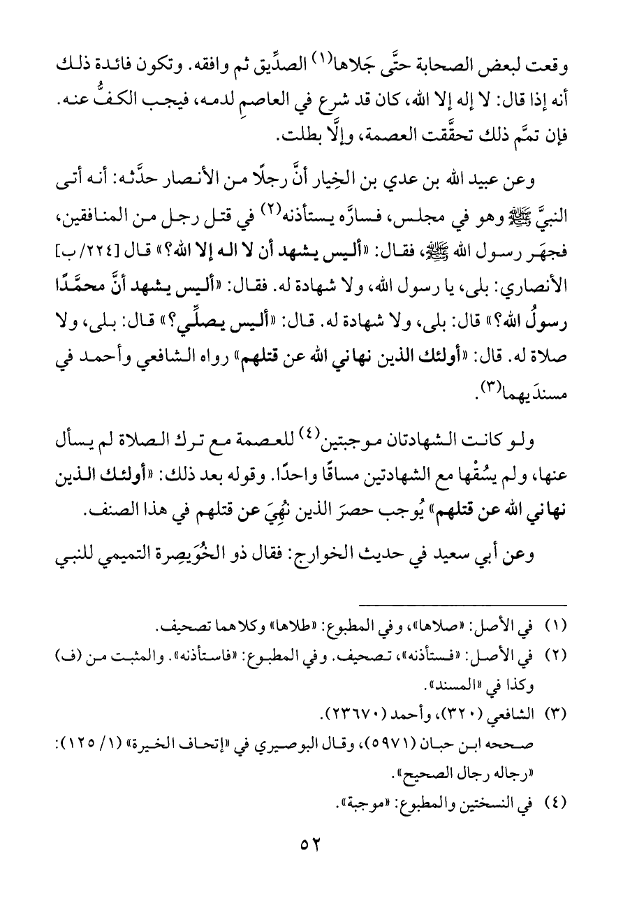 ولو كانت الشهادتان موجبتين (¬٤) للعصمة مع ترك الصلاة لم يسأل عنها، ولم يسُقْها مع الشهادتين مساقًا واحدًا. وقوله بعد ذلك: «أولئك الذين نهاني الله عن قتلهم» يُوجب حصرَ الذين نُهِيَ عن قتلهم في هذا الصنف.