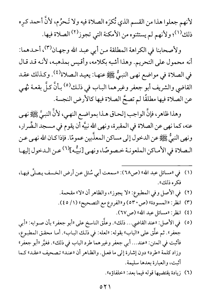 ولأصحابنا في الكراهة المطلقة من أبي عبد الله وجهان (¬٣)، أحدهما: أنه محمول على التحريم. وهذا أشبه بكلامه، وأقيس بمذهبه، لأنه قد قال في الصلاة في مواضع نهى النبيُّ - صلى الله عليه وسلم - عنها: يعيد الصلاة (¬٤). وكذلك عقد القاضي والشريف أبو جعفر وغيرهما الباب في ذلك (¬٥) بأنَّ كلَّ بقعة نُهي عن الصلاة فيها مطلقًا لم تصحَّ الصلاة فيها كالأرض النجسة.