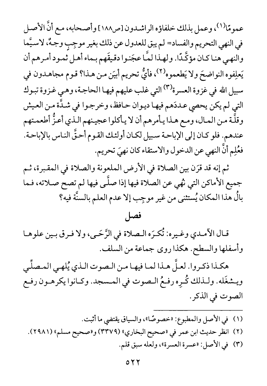 عمومًا (¬١)، وعمل بذلك خلفاؤه الراشدون [ص ١٨٨] وأصحابه، مع أنَّ الأصل في النهي التحريم والفساد= لم يبق للعدول عن ذلك بغير موجِبٍ وجهٌ، لاسيَّما والنهي هنا كان مؤكَّدًا. ولهذا لمَّا عجَنوا دقيقَهم بماء أهل ثمود أمرهم أن يَعلِفوه النواضحَ ولا يَطعموه (¬٢)، فأيُّ تحريم أبيَن من هذا؟ قوم مجاهدون في سبيل الله في غزوة العسرة (¬٣) التي غلب عليهم فيها الحاجة، وهي غزوة تبوك التي لم يكن يحصي عددَهم فيها ديوان حافظ، وخرجوا في شدَّة من العيش وقلَّة من المال، ومع هذا يأمرهم أن لا يأكلوا عجينهم الذي أعزُّ أطعمتهم عندهم. فلو كان إلى الإباحة سبيل لكان أولئك القوم أحقَّ الناس بالإباحة. فعُلِم أنَّ النهي عن الدخول والاستقاء كان نهيَ تحريم.