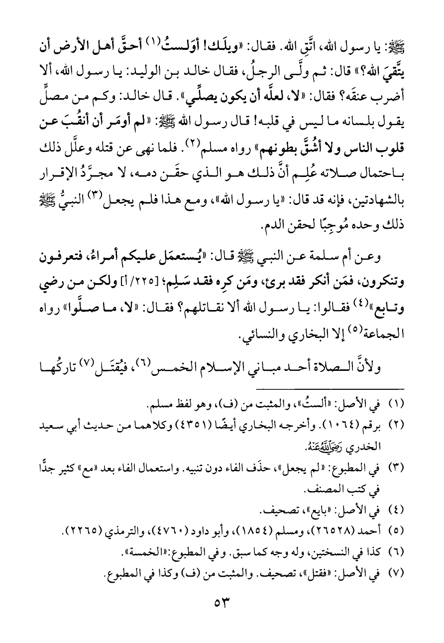 - صلى الله عليه وسلم -: يا رسول الله، اتَّقِ الله. فقال: «ويلَك! أوَلستُ (¬١) أحقَّ أهل الأرض أن يتَّقيَ الله؟» قال: ثم ولَّى الرجلُ، فقال خالد بن الوليد: يا رسول الله، ألا أضرب عنقَه؟ فقال: «لا، لعلَّه أن يكون يصلِّي». قال خالد: وكم من مصلٍّ يقول بلسانه ما ليس في قلبه! قال رسول الله - صلى الله عليه وسلم -: «لم أومَر أن أنقُبَ عن قلوب الناس ولا أشُقَّ بطونهم» رواه مسلم (¬٢). فلما نهى عن قتله وعلَّل ذلك باحتمال صلاته عُلِم أنَّ ذلك هو الذي حقَن دمه، لا مجرَّدُ الإقرار بالشهادتين، فإنه قد قال: «يا رسول الله»، ومع هذا فلم يجعل (¬٣) النبيُّ - صلى الله عليه وسلم - ذلك وحده مُوجِبًا لحقن الدم.