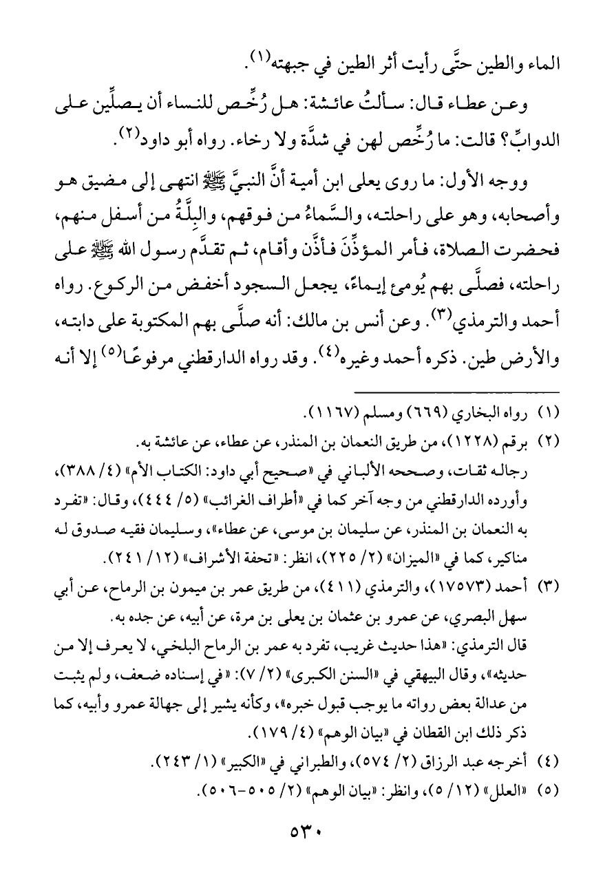 وعن عطاء قال: سألتُ عائشة: هل رُخِّص للنساء أن يصلِّين على الدوابِّ؟ قالت: ما رُخِّص لهن في شدَّة ولا رخاء. رواه أبو داود (¬٢).