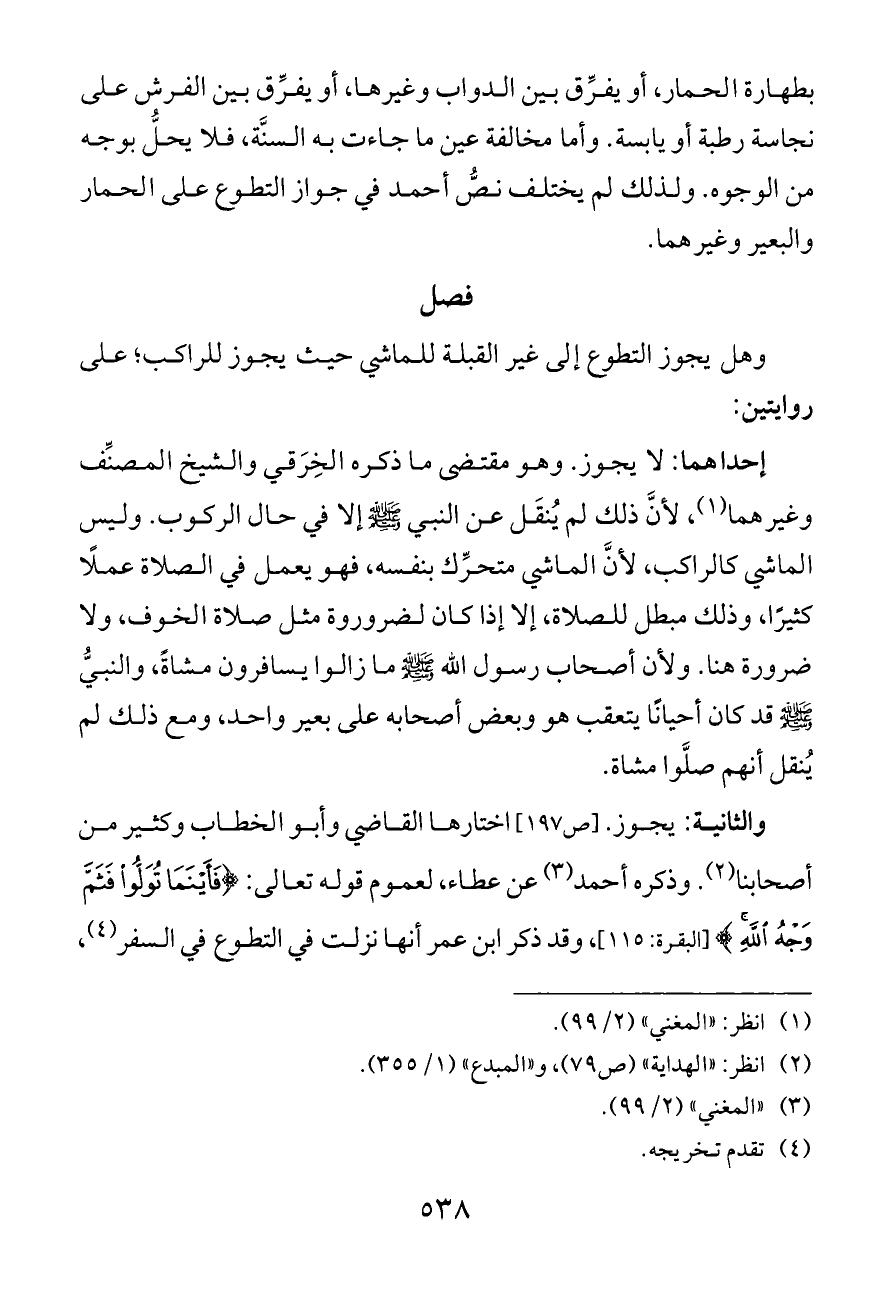 بطهارة الحمار، أو يفرِّق بين الدواب وغيرها، أو يفرِّق بين الفرش على نجاسة رطبة أو يابسة. وأما مخالفة عين ما جاءت به السنَّة، فلا يحلُّ بوجه من الوجوه. ولذلك لم يختلف نصُّ أحمد في جواز التطوع على الحمار والبعير وغيرهما.