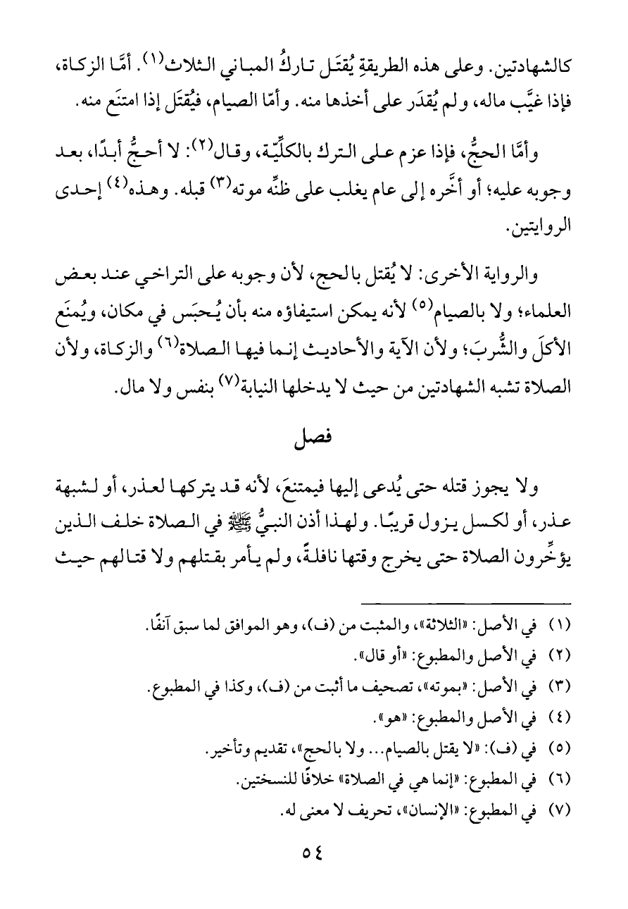 والرواية الأخرى: لا يُقتل بالحج، لأن وجوبه على التراخي عند بعض العلماء؛ ولا بالصيام (¬٥) لأنه يمكن استيفاؤه منه بأن يُحبَس في مكان، ويُمنَع الأكلَ والشُّربَ؛ ولأن الآية والأحاديث إنما فيها الصلاة (¬٦) والزكاة، ولأن الصلاة تشبه الشهادتين من حيث لا يدخلها النيابة (¬٧) بنفس ولا مال.