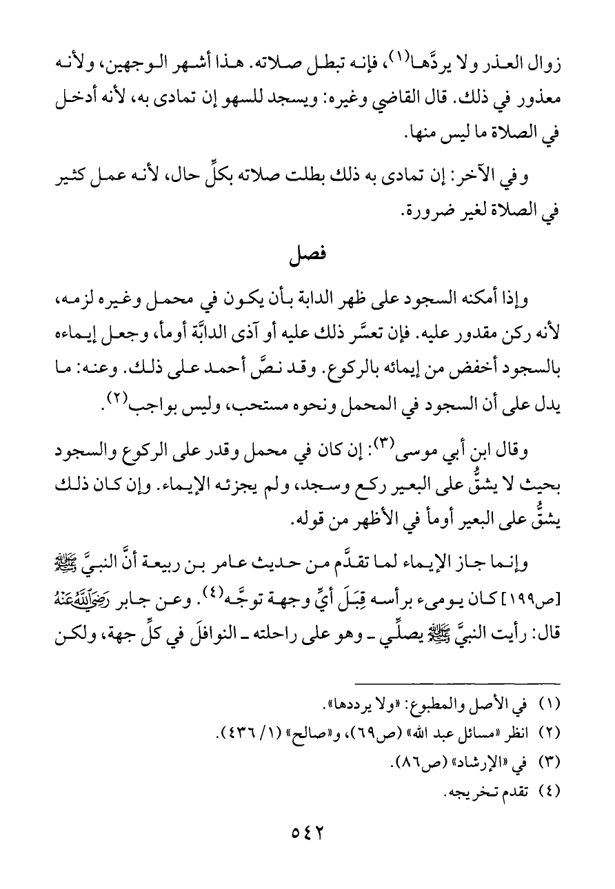 وإنما جاز الإيماء لما تقدَّم من حديث عامر بن ربيعة أنَّ النبيَّ - صلى الله عليه وسلم -[ص ١٩٩] كان يومئ برأسه قِبَلَ أيِّ وجهة توجَّه (¬٤). وعن جابر - رضي الله عنه - قال: رأيت النبيَّ - صلى الله عليه وسلم - يصلِّي ــ وهو على راحلته ــ النوافلَ في كلِّ جهة، ولكن