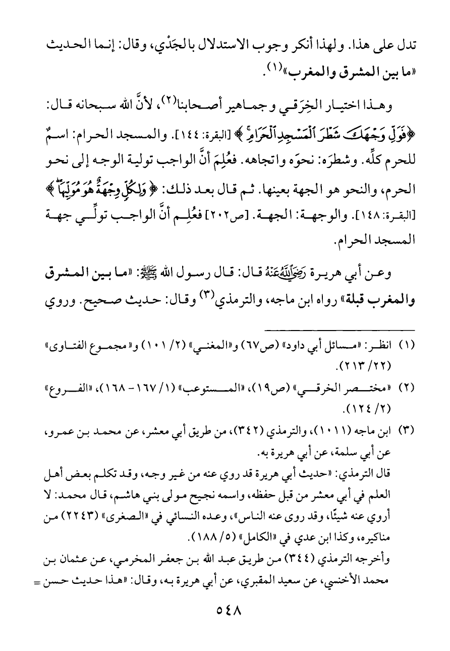 وعن أبي هريرة - رضي الله عنه - قال: قال رسول الله - صلى الله عليه وسلم -: «ما بين المشرق والمغرب قبلة» رواه ابن ماجه، والترمذي (¬٣)