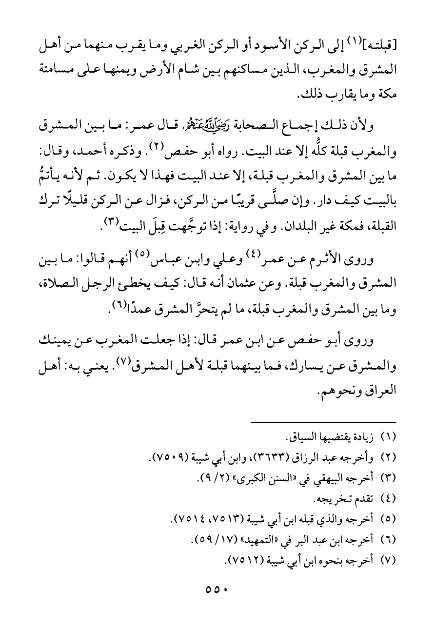ولأن ذلك إجماع الصحابة - رضي الله عنهم -. قال عمر: ما بين المشرق والمغرب قبلة كلُّه إلا عند البيت. رواه أبو حفص (¬٢). وذكره أحمد، وقال: ما بين المشرق والمغرب قبلة، إلا عند البيت فهذا لا يكون. ثم لأنه يأتمُّ بالبيت كيف دار. وإن صلَّى قريبًا من الركن، فزال عن الركن قليلًا ترك القبلة، فمكة غير البلدان. وفي رواية: إذا توجَّهت قِبلَ البيت (¬٣).