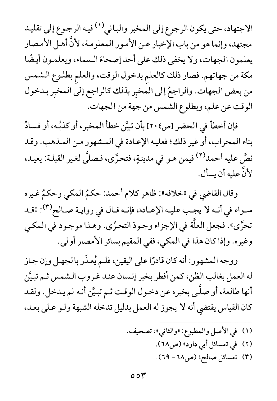 فإن أخطأ في الحضر [ص ٢٠٤] بأن تبيَّن خطأ المخبر، أو كذبُه، أو فسادُ بناء المحراب، أو غير ذلك؛ فعليه الإعادة في المشهور من المذهب. وقد نصَّ عليه أحمد (¬٢) فيمن هو في مدينةٍ، فتحرَّى، فصلَّى لغير القبلة: يعيد، لأنَّ عليه أن يسأل.