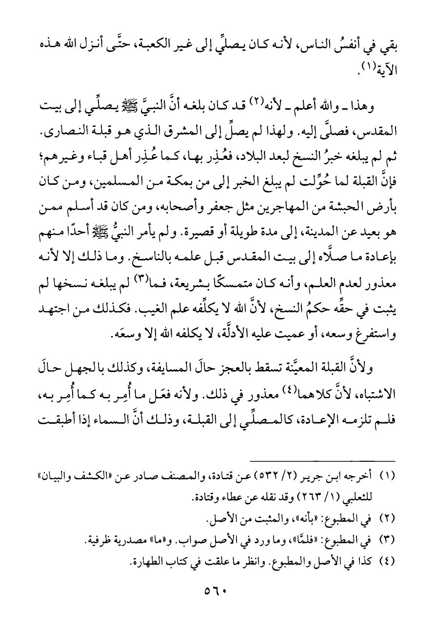 وهذا ــ والله أعلم ــ لأنه (¬٢) قد كان بلغه أنَّ النبيَّ - صلى الله عليه وسلم - يصلِّي إلى بيت المقدس، فصلَّى إليه. ولهذا لم يصلِّ إلى المشرق الذي هو قبلة النصارى. ثم لم يبلغه خبرُ النسخ لبعد البلاد، فعُذِر بها، كما عُذِر أهل قباء وغيرهم؛ فإنَّ القبلة لما حُوِّلت لم يبلغ الخبر إلى من بمكة من المسلمين، ومن كان بأرض الحبشة من المهاجرين مثل جعفر وأصحابه، ومن كان قد أسلم ممن هو بعيد عن المدينة، إلى مدة طويلة أو قصيرة. ولم يأمر النبيُّ - صلى الله عليه وسلم - أحدًا منهم بإعادة ما صلَّاه إلى بيت المقدس قبل علمه بالناسخ. وما ذلك إلا لأنه معذور لعدم العلم، وأنه كان متمسكًا بشريعة، فما (¬٣) لم يبلغه نسخها لم يثبت في حقِّه حكمُ النسخ، لأنَّ الله لا يكلِّفه علم الغيب. فكذلك من اجتهد واستفرغ وسعه، أو عميت عليه الأدلَّة، لا يكلفه الله إلا وسعَه.