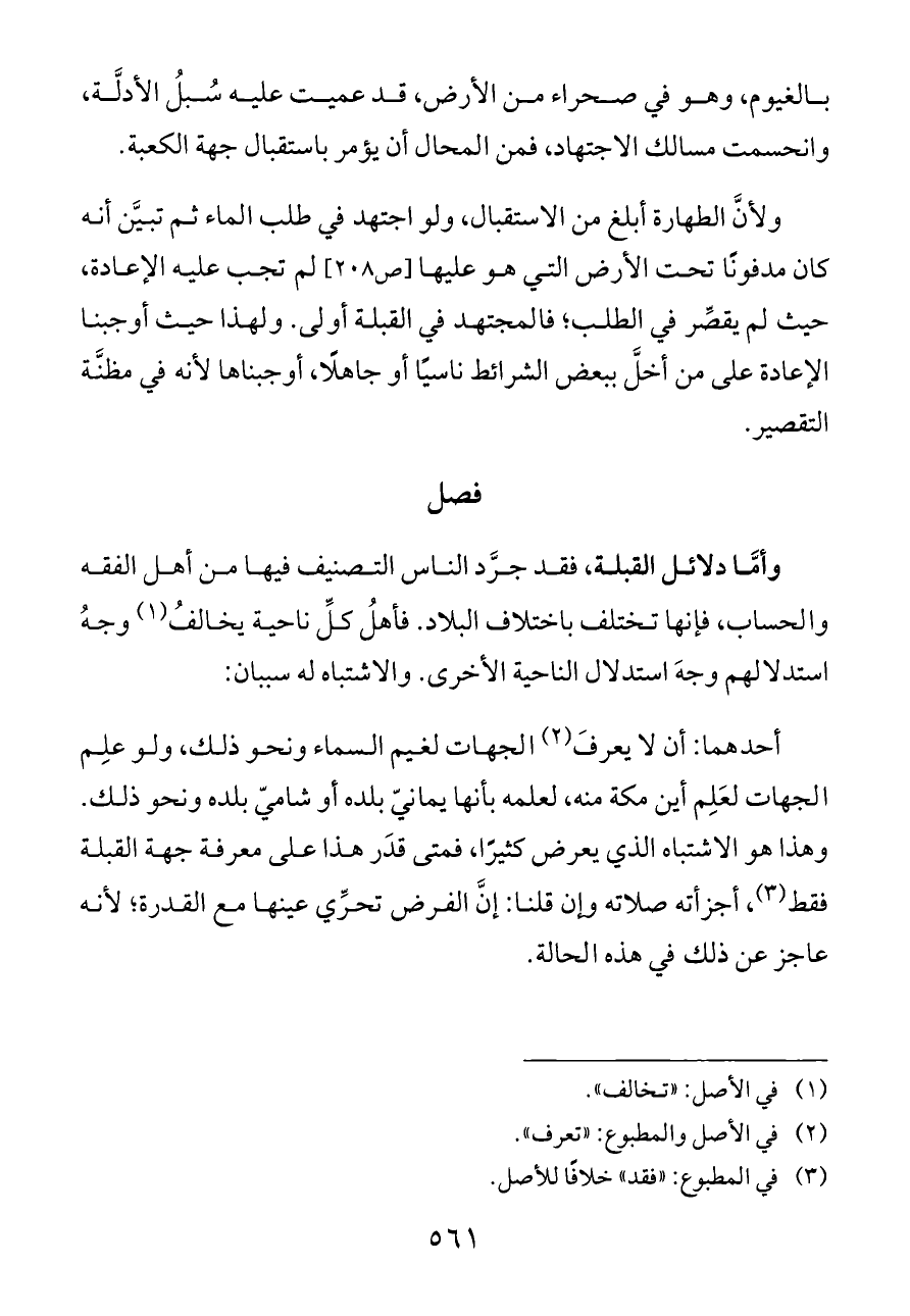 ولأنَّ الطهارة أبلغ من الاستقبال، ولو اجتهد في طلب الماء ثم تبيَّن أنه كان مدفونًا تحت الأرض التي هو عليها [ص ٢٠٨] لم تجب عليه الإعادة، حيث لم يقصِّر في الطلب؛ فالمجتهد في القبلة أولى. ولهذا حيث أوجبنا الإعادة على من أخلَّ ببعض الشرائط ناسيًا أو جاهلًا، أوجبناها لأنه في مظنَّة التقصير.