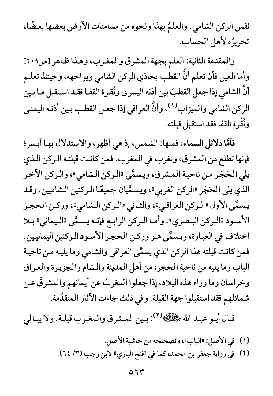 والمقدمة الثانية: العلم بجهة المشرق والمغرب، وهذا ظاهر [ص ٢٠٩] وأما العين فأن تعلم أنَّ القطب يحاذي الركن الشامي ويواجهه، وحينئذ تعلم أنَّ الشامي إذا جعل القطبَ بين أذنه اليسرى ونُقرة القفا فقد استقبل ما بين الركن الشامي والميزاب (¬١)، وأنَّ العراقي إذا جعل القطب بين أذنه اليمنى ونُقْرة القفا فقد استقبل قبلته.