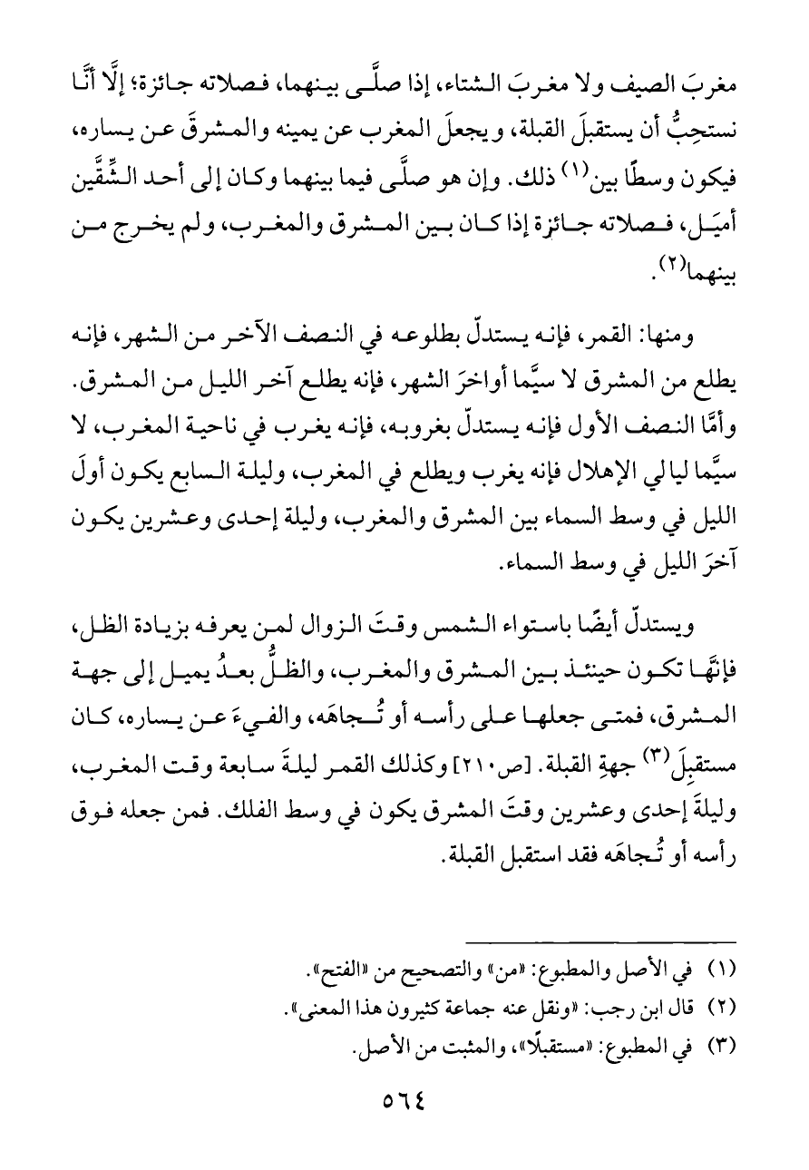 ويستدلّ أيضًا باستواء الشمس وقتَ الزوال لمن يعرفه بزيادة الظل، فإنَّها تكون حينئذ بين المشرق والمغرب، والظلُّ بعدُ يميل إلى جهة المشرق، فمتى جعلها على رأسه أو تُجاهَه، والفيءَ عن يساره، كان مستقبِلَ (¬٣) جهةِ القبلة. [ص ٢١٠] وكذلك القمر ليلةَ سابعة وقت المغرب، وليلةَ إحدى وعشرين وقتَ المشرق يكون في وسط الفلك. فمن جعله فوق رأسه أو تُجاهَه فقد استقبل القبلة.