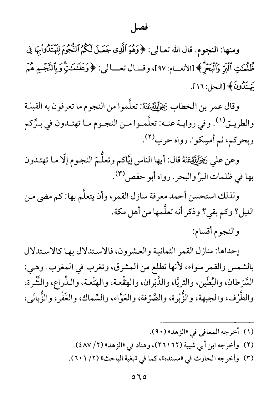 وقال عمر بن الخطاب - رضي الله عنه -: تعلَّموا من النجوم ما تعرفون به القبلة والطريق (¬١). وفي رواية عنه: تعلَّموا من النجوم ما تهتدون في برِّكم وبحركم، ثم أمسِكوا. رواه حرب (¬٢).