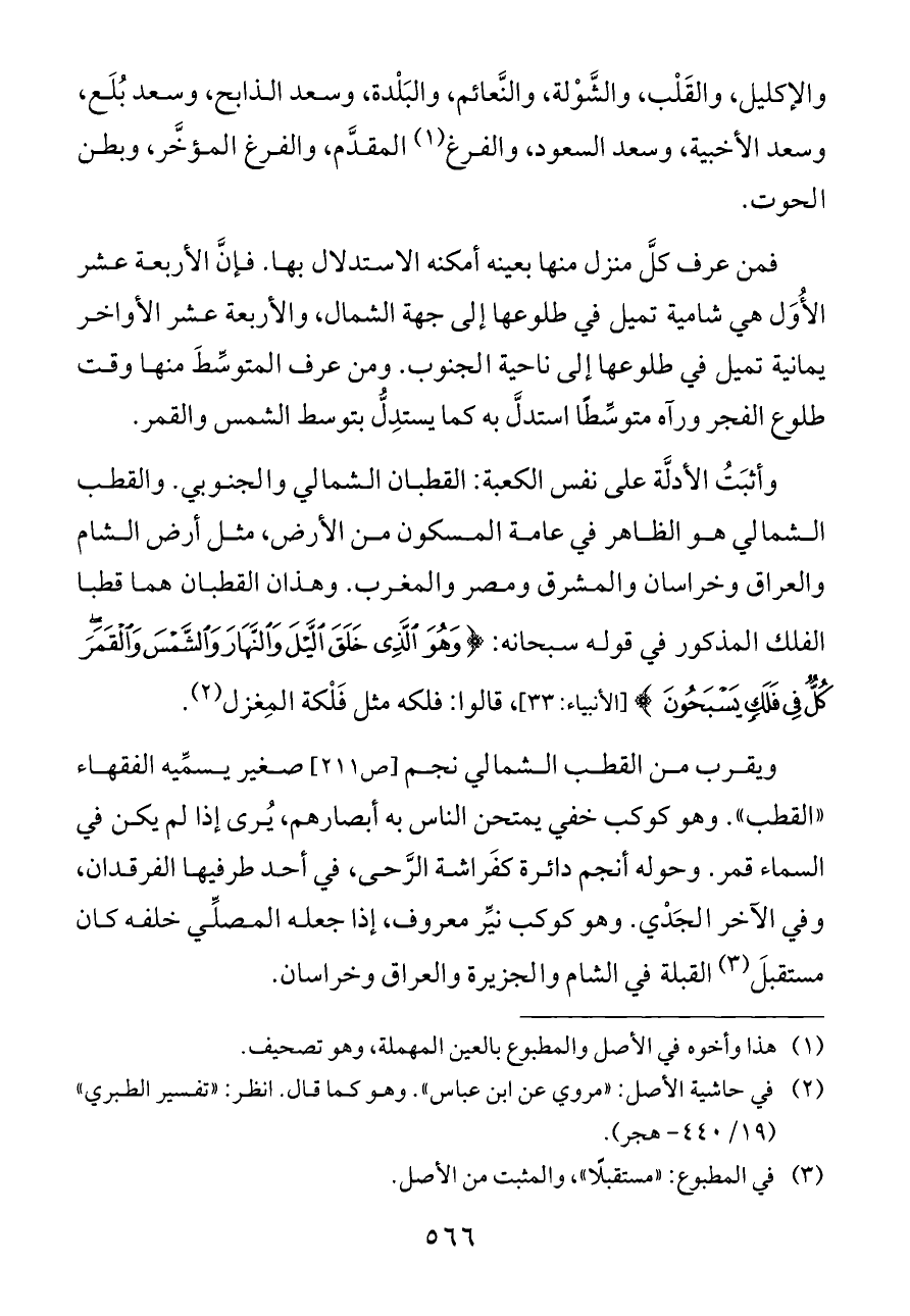 ويقرب من القطب الشمالي نجم [ص ٢١١] صغير يسمِّيه الفقهاء «القطب». وهو كوكب خفي يمتحن الناس به أبصارهم، يُرى إذا لم يكن في السماء قمر. وحوله أنجم دائرة كفَراشة الرَّحى، في أحد طرفيها الفرقدان، وفي الآخر الجَدْي. وهو كوكب نيِّر معروف، إذا جعله المصلِّي خلفه كان مستقبلَ (¬٣) القبلة في الشام والجزيرة والعراق وخراسان.