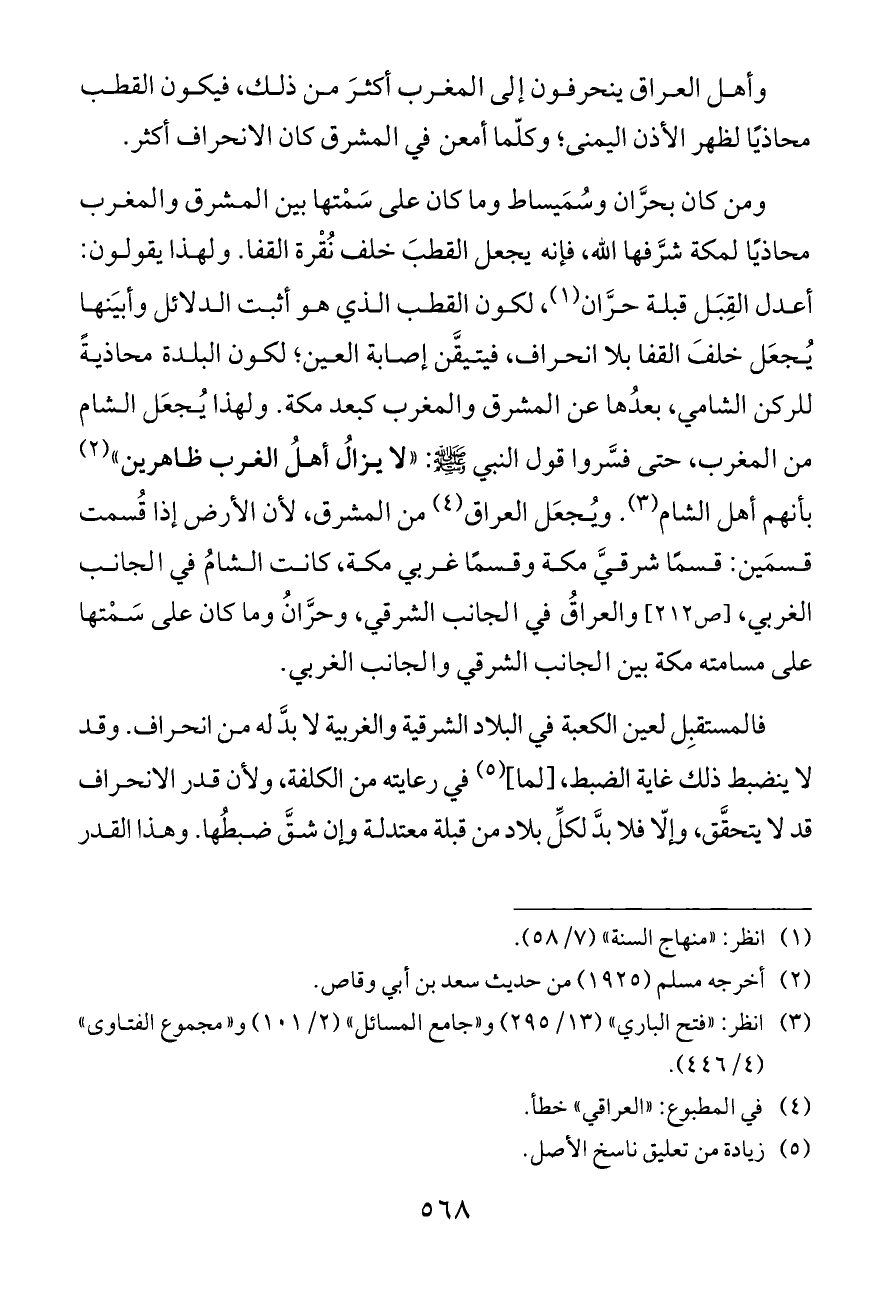 ومن كان بحرَّان وسُمَيساط وما كان على سَمْتها بين المشرق والمغرب محاذيًا لمكة شرَّفها الله، فإنه يجعل القطبَ خلف نُقْرة القفا. ولهذا يقولون: أعدل القِبَل قبلة حرَّان (¬١)، لكون القطب الذي هو أثبت الدلائل وأبيَنها يُجعَل خلفَ القفا بلا انحراف، فيتيقَّن إصابة العين؛ لكون البلدة محاذيةً للركن الشامي، بعدُها عن المشرق والمغرب كبعد مكة. ولهذا يُجعَل الشام من المغرب، حتى فسَّروا قول النبي - صلى الله عليه وسلم -: «لا يزالُ أهلُ الغرب ظاهرين» (¬٢) بأنهم أهل الشام (¬٣). ويُجعَل العراق (¬٤) من المشرق، لأن الأرض إذا قُسمت قسمَين: قسمًا شرقيَّ مكة وقسمًا غربي مكة، كانت الشامُ في الجانب الغربي، [ص ٢١٢] والعراقُ في الجانب الشرقي، وحرَّانُ وما كان على سَمْتها على مسامته مكة بين الجانب الشرقي والجانب الغربي.