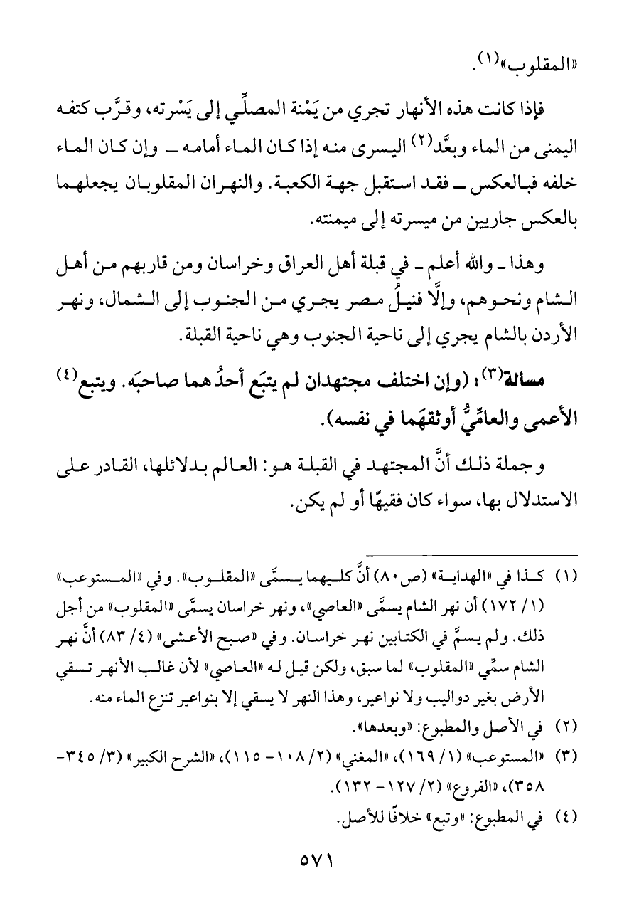 (¬١) كذا في «الهداية» (ص ٨٠) أنَّ كليهما يسمَّى «المقلوب». وفي «المستوعب» (١/ ١٧٢) أن نهر الشام يسمَّى «العاصي»، ونهر خراسان يسمَّى «المقلوب» من أجل ذلك. ولم يسمَّ في الكتابين نهر خراسان. وفي «صبح الأعشى» (٤/ ٨٣) أنَّ نهر الشام سمِّي «المقلوب» لما سبق، ولكن قيل له «العاصي» لأن غالب الأنهر تسقي الأرض بغير دواليب ولا نواعير، وهذا النهر لا يسقي إلا بنواعير تنزع الماء منه.