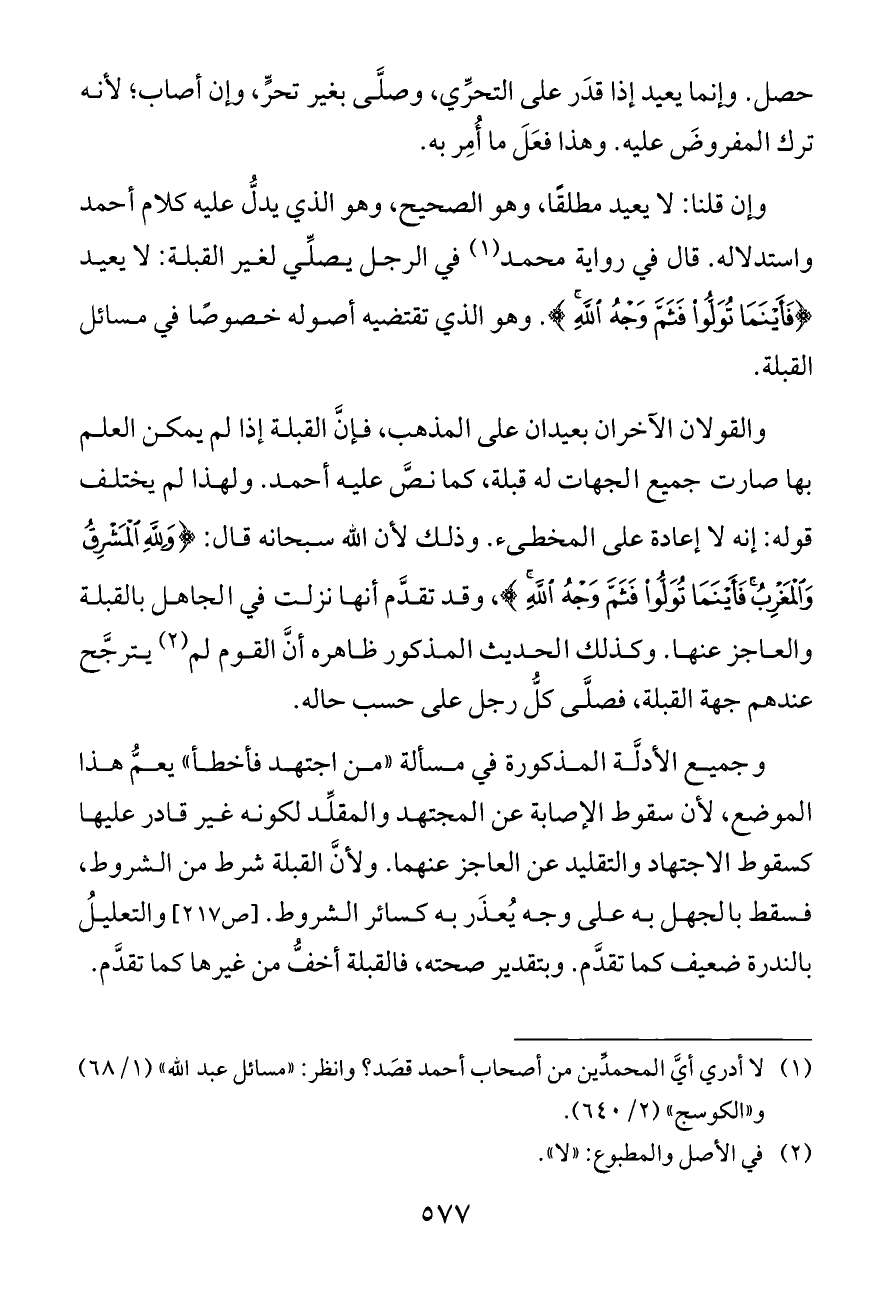 وجميع الأدلَّة المذكورة في مسألة «من اجتهد فأخطأ» يعمُّ هذا الموضع، لأن سقوط الإصابة عن المجتهد والمقلِّد لكونه غير قادر عليها كسقوط الاجتهاد والتقليد عن العاجز عنهما. ولأنَّ القبلة شرط من الشروط، فسقط بالجهل به على وجه يُعذَر به كسائر الشروط. [ص ٢١٧] والتعليلُ بالندرة ضعيف كما تقدَّم. وبتقدير صحته، فالقبلة أخفُّ من غيرها كما تقدَّم.