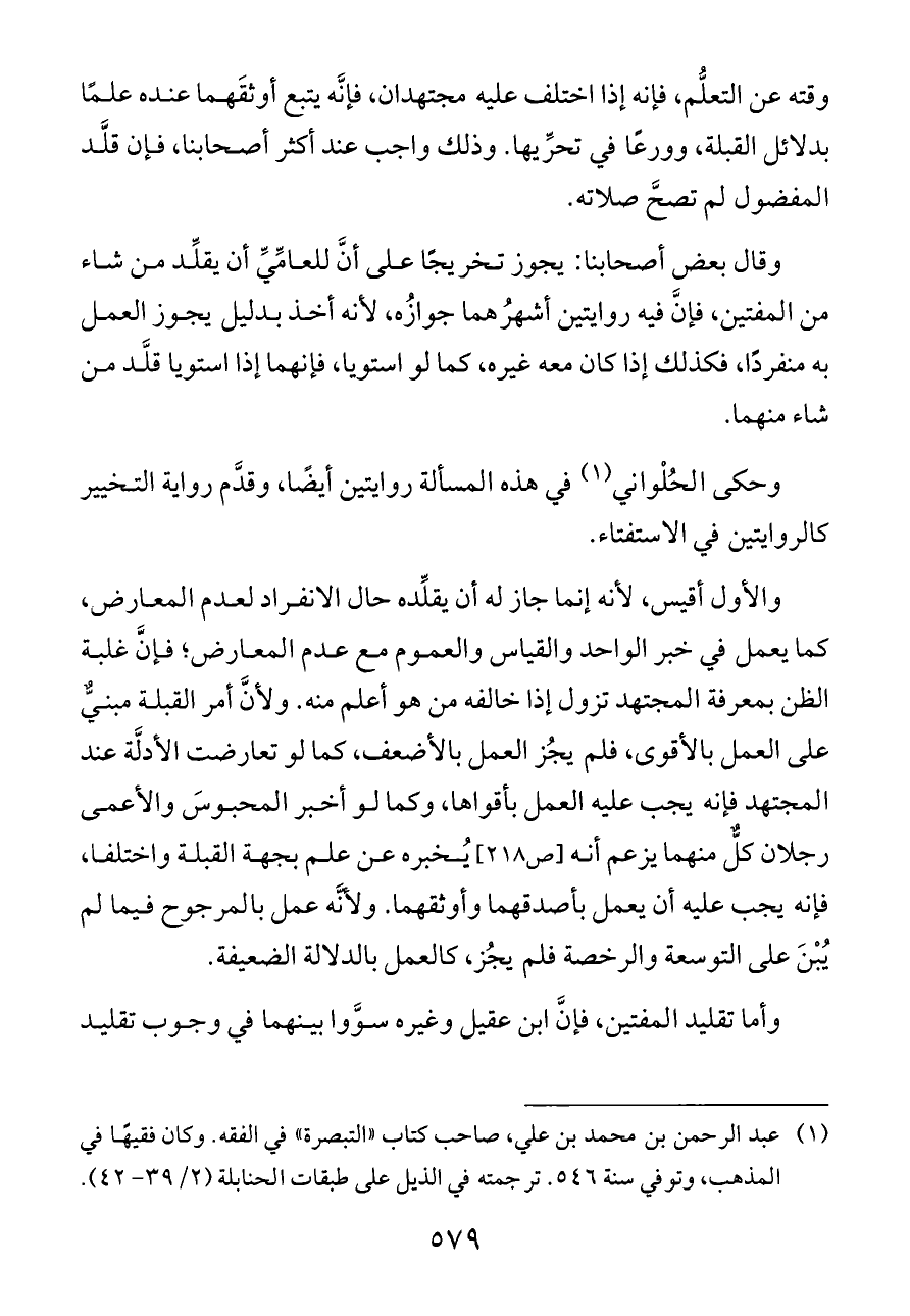 وقته عن التعلُّم، فإنه إذا اختلف عليه مجتهدان، فإنَّه يتبع أوثقَهما عنده علمًا بدلائل القبلة، وورعًا في تحرِّيها. وذلك واجب عند أكثر أصحابنا، فإن قلَّد المفضول لم تصحَّ صلاته.