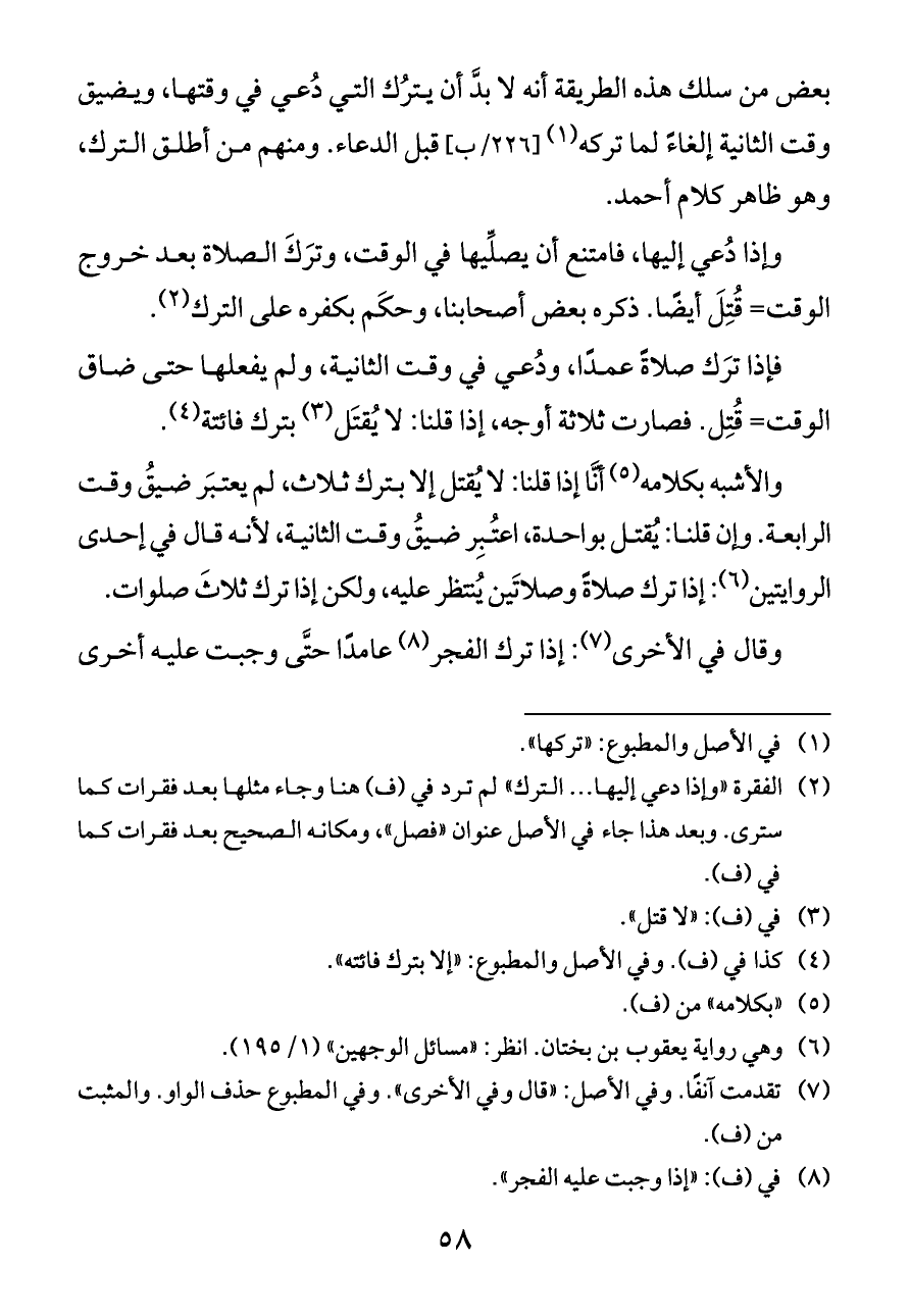 (¬٢) الفقرة «وإذا دعي إليها ... الترك» لم ترد في (ف) هنا وجاء مثلها بعد فقرات كما سترى. وبعد هذا جاء في الأصل عنوان «فصل»، ومكانه الصحيح بعد فقرات كما في (ف).