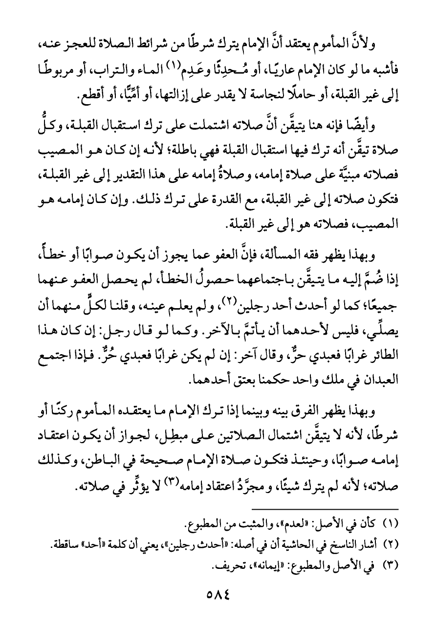 وبهذا يظهر فقه المسألة، فإنَّ العفو عما يجوز أن يكون صوابًا أو خطأً، إذا ضُمَّ إليه ما يتيقَّن باجتماعهما حصولُ الخطأ، لم يحصل العفو عنهما جميعًا؛ كما لو أحدث أحد رجلين (¬٢)، ولم يعلم عينه، وقلنا لكلٍّ منهما أن يصلِّي، فليس لأحدهما أن يأتمَّ بالآخر. وكما لو قال رجل: إن كان هذا الطائر غرابًا فعبدي حرٌّ، وقال آخر: إن لم يكن غرابًا فعبدي حُرٌّ. فإذا اجتمع العبدان في ملك واحد حكمنا بعتق أحدهما.