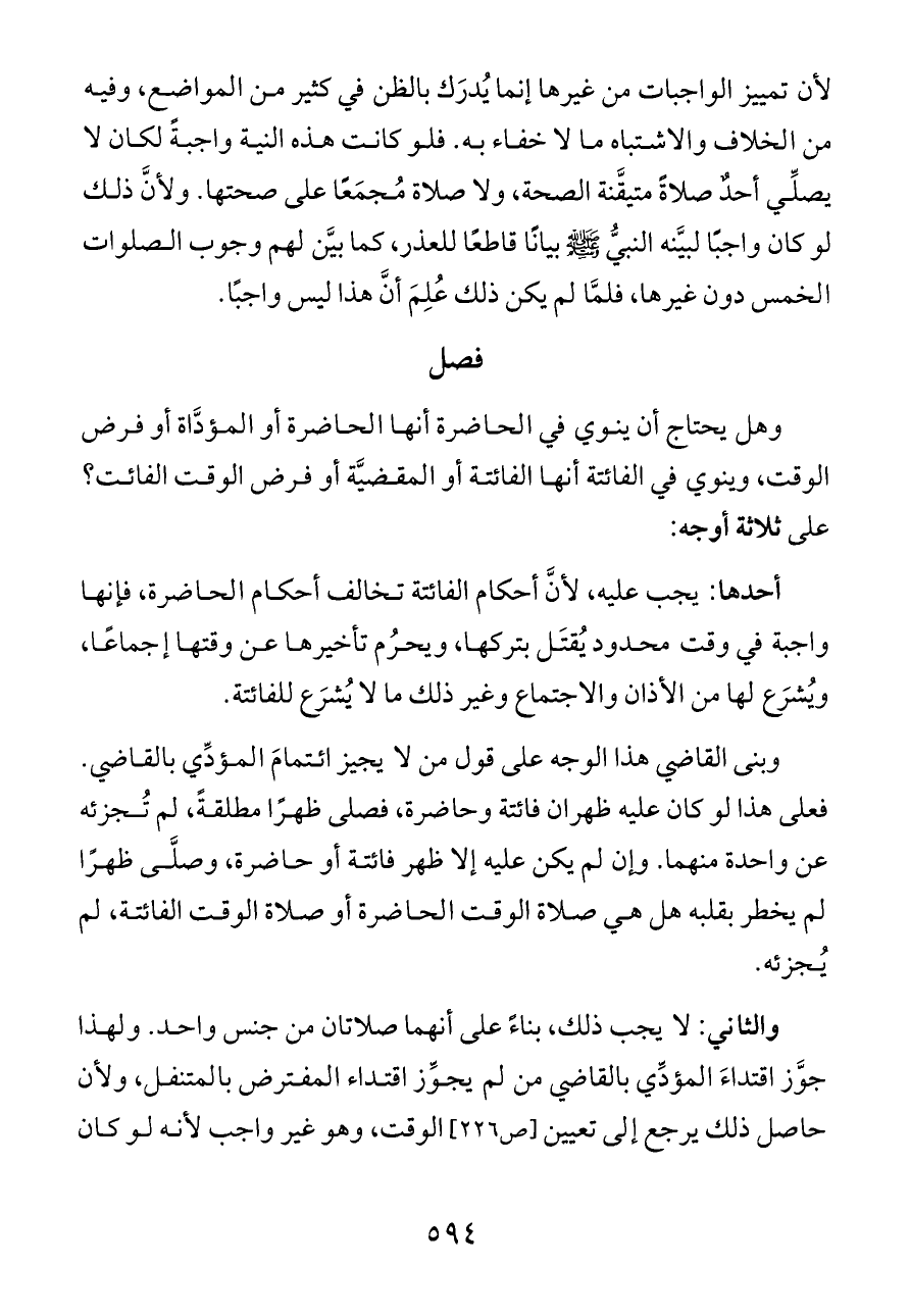 والثاني: لا يجب ذلك، بناءً على أنهما صلاتان من جنس واحد. ولهذا جوَّز اقتداءَ المؤدِّي بالقاضي من لم يجوِّز اقتداء المفترض بالمتنفل، ولأن حاصل ذلك يرجع إلى تعيين [ص ٢٢٦] الوقت، وهو غير واجب لأنه لو كان