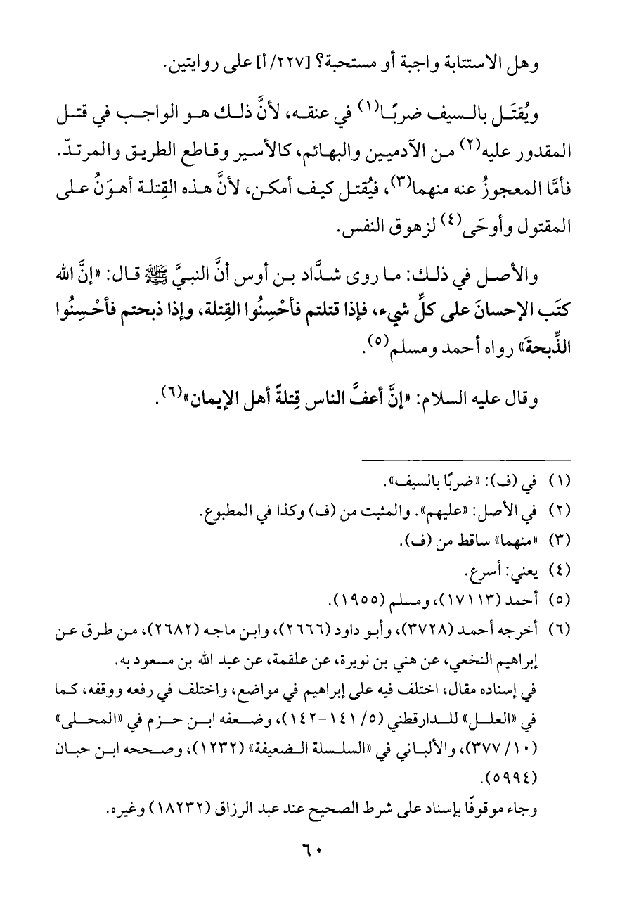 والأصل في ذلك: ما روى شدَّاد بن أوس أنَّ النبيَّ - صلى الله عليه وسلم - قال: «إنَّ الله كتَب الإحسانَ على كلِّ شيء، فإذا قتلتم فأحْسِنُوا القِتلة، وإذا ذبحتم فأحْسِنُوا الذِّبحةَ» رواه أحمد ومسلم (¬٥).