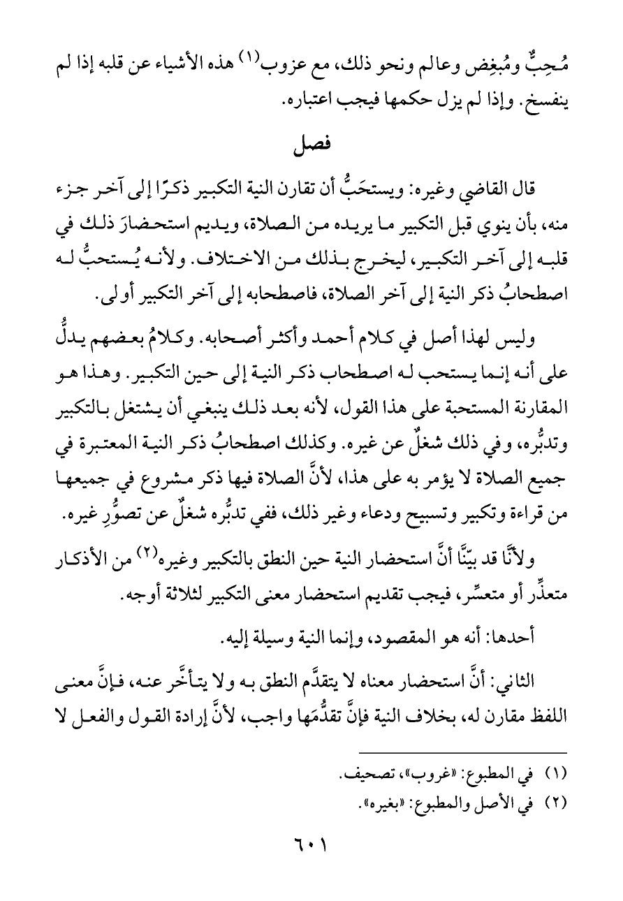 وليس لهذا أصل في كلام أحمد وأكثر أصحابه. وكلامُ بعضهم يدلُّ على أنه إنما يستحب له اصطحاب ذكر النية إلى حين التكبير. وهذا هو المقارنة المستحبة على هذا القول، لأنه بعد ذلك ينبغي أن يشتغل بالتكبير وتدبُّره، وفي ذلك شغلٌ عن غيره. وكذلك اصطحابُ ذكر النية المعتبرة في جميع الصلاة لا يؤمر به على هذا، لأنَّ الصلاة فيها ذكر مشروع في جميعها من قراءة وتكبير وتسبيح ودعاء وغير ذلك، ففي تدبُّره شغلٌ عن تصوُّرِ غيره.