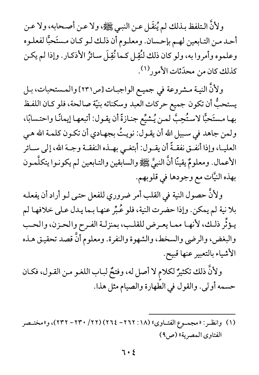 ولأنَّ النية مشروعة في جميع الواجبات [ص ٢٣١] والمستحبات، بل يستحبُّ أن تكون جميع حركات العبد وسكناته بنيّة صالحة، فلو كان اللفظ بها مستَحبًّا لاستُحِبَّ لمن يُشيِّع جنازةً أن يقول: أتبعها إيمانًا واحتسابًا، ولمن جاهد في سبيل الله أن يقول: نويتُ بجهادي أن تكون كلمة الله هي العليا، وإذا أنفق نفقةً أن يقول: أبتغي بهذه النفقة وجهَ الله، إلى سائر الأعمال. ومعلومٌ يقينًا أنَّ النبيَّ - صلى الله عليه وسلم - والسابقين والتابعين لم يكونوا يتكلَّمون بهذه النيَّات مع وجودها في قلوبهم.