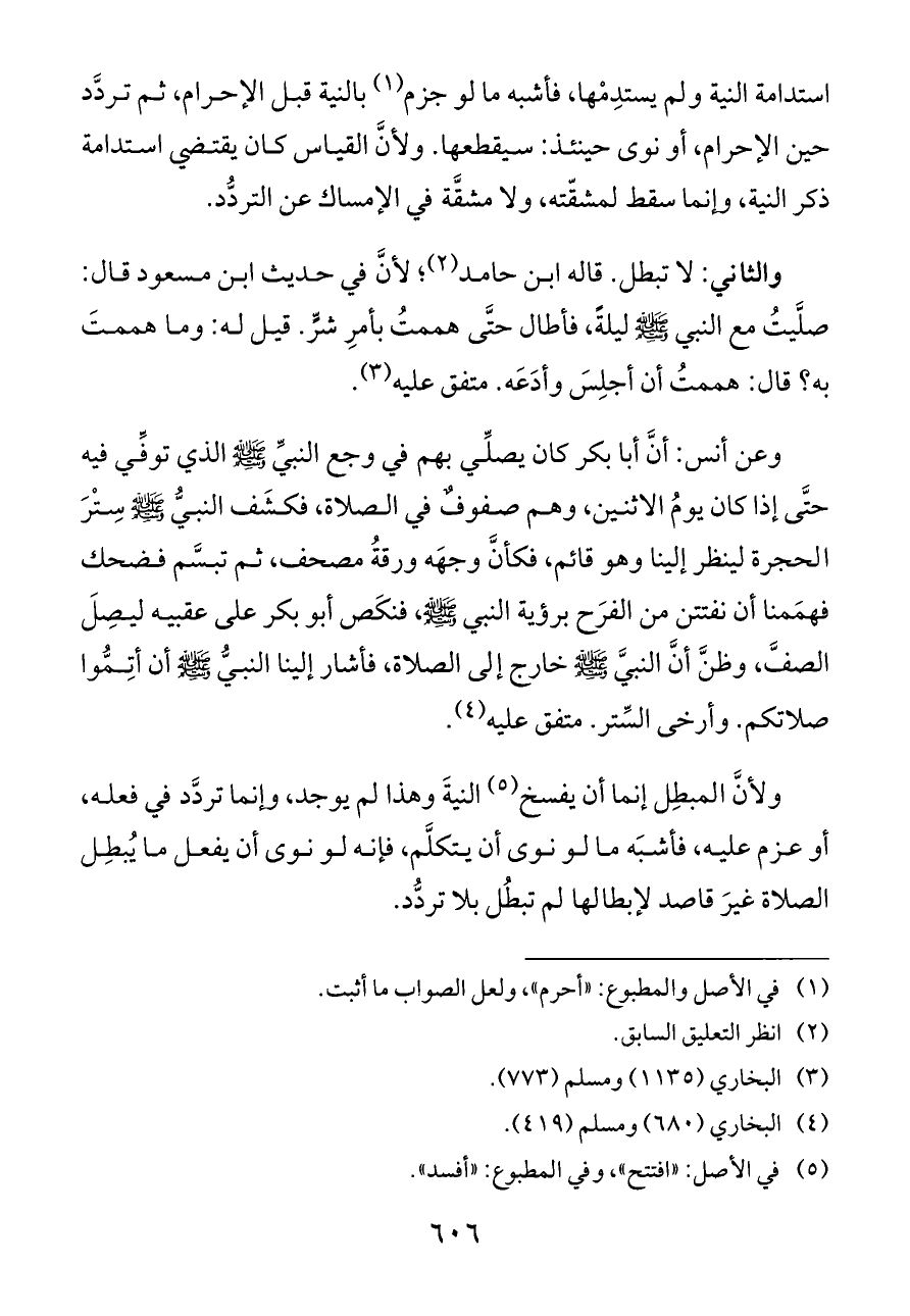 ولأنَّ المبطِل إنما أن يفسخ (¬٥) النيةَ وهذا لم يوجد، وإنما تردَّد في فعله، أو عزم عليه، فأشبَه ما لو نوى أن يتكلَّم، فإنه لو نوى أن يفعل ما يُبطِل الصلاة غيرَ قاصد لإبطالها لم تبطُل بلا تردُّد.