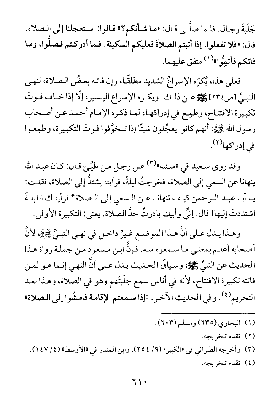 فعلى هذا، يُكرَه الإسراعُ الشديد مطلقًا، وإن فاته بعضُ الصلاة، لنهي النبيِّ [ص ٢٣٤]- صلى الله عليه وسلم - عن ذلك. ويكره الإسراع اليسير، إلّا إذا خاف فوتَ تكبيرة الافتتاح، وطمِع في إدراكها، لما ذكره الإمام أحمد عن أصحاب رسول الله - صلى الله عليه وسلم -: أنهم كانوا يعجِّلون شيئًا إذا تخوَّفوا فوتَ التكبيرة، وطمِعوا في إدراكها (¬٢).
