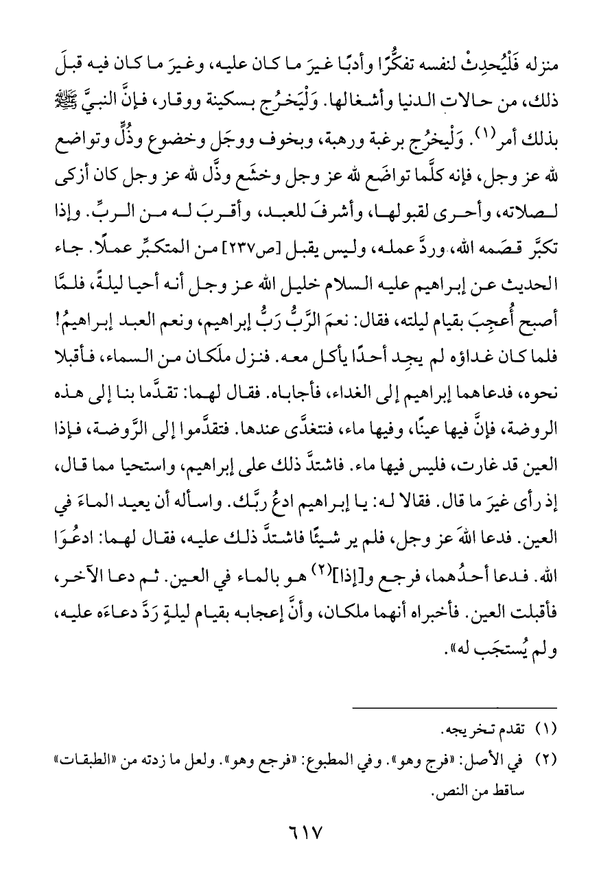 منزله فَلْيُحدِثْ لنفسه تفكُّرًا وأدبًا غيرَ ما كان عليه، وغيرَ ما كان فيه قبلَ ذلك، من حالات الدنيا وأشغالها. وَلْيَخرُج بسكينة ووقار، فإنَّ النبيَّ - صلى الله عليه وسلم - بذلك أمر (¬١). وَلْيخرُج برغبة ورهبة، وبخوف ووجَل وخضوع وذُلٍّ وتواضع لله عز وجل، فإنه كلَّما تواضَع لله عز وجل وخشَع وذَّل لله عز وجل كان أزكى لصلاته، وأحرى لقبولها، وأشرفَ للعبد، وأقربَ له من الربِّ. وإذا تكبَّر قصَمه الله، وردَّ عمله، وليس يقبل [ص ٢٣٧] من المتكبِّر عملًا. جاء الحديث عن إبراهيم عليه السلام خليل الله عز وجل أنه أحيا ليلةً، فلمَّا أصبح أُعجِبَ بقيام ليلته، فقال: نعمَ الرَّبُّ رَبُّ إبراهيم، ونعم العبد إبراهيمُ! فلما كان غداؤه لم يجِد أحدًا يأكل معه. فنزل ملَكان من السماء، فأقبلا نحوه، فدعاهما إبراهيم إلى الغداء، فأجاباه.