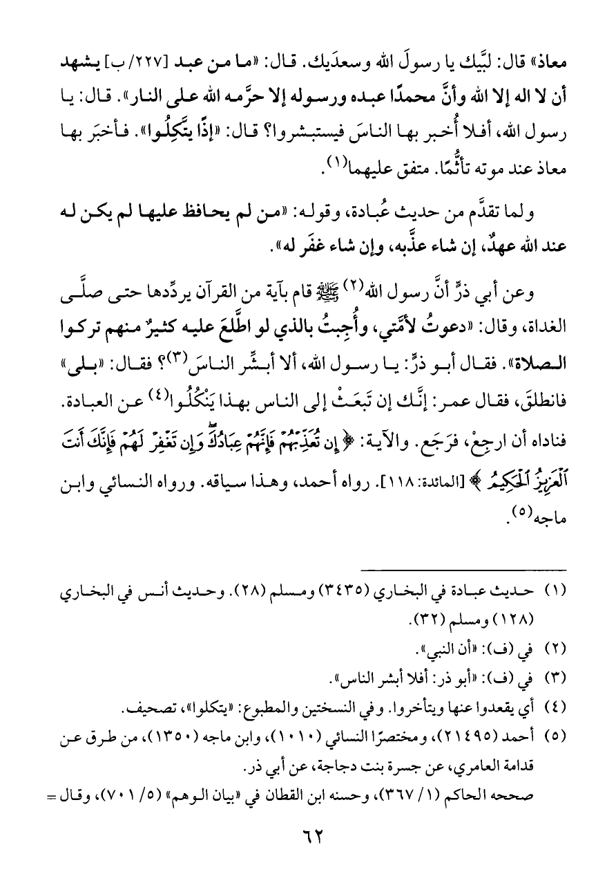 وعن أبي ذرٍّ أنَّ رسول الله (¬٢) - صلى الله عليه وسلم - قام بآية من القرآن يردِّدها حتى صلَّى الغداة، وقال: «دعوتُ لأمَّتي، وأُجِبتُ بالذي لو اطَّلعَ عليه كثيرٌ منهم تركوا الصلاة». فقال أبو ذرٍّ: يا رسول الله، ألا أبشِّر الناسَ (¬٣)؟ فقال: «بلى» فانطلقَ، فقال عمر: إنَّك إن تَبعَثْ إلى الناس بهذا يَنْكُلُوا (¬٤) عن العبادة. فناداه أن ارجِعْ، فرَجَع. والآية: {إِنْ تُعَذِّبْهُمْ فَإِنَّهُمْ عِبَادُكَ وَإِنْ تَغْفِرْ لَهُمْ فَإِنَّكَ أَنْتَ الْعَزِيزُ الْحَكِيمُ} [المائدة: ١١٨]. رواه أحمد، وهذا سياقه. ورواه النسائي وابن ماجه (¬٥).