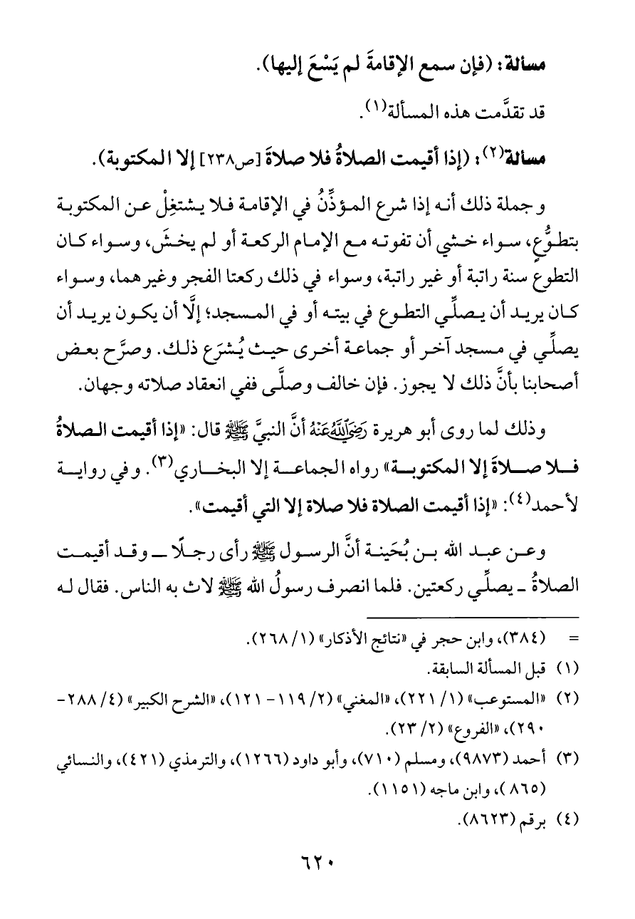 مسألة (¬٢): (إذا أقيمت الصلاةُ فلا صلاةَ [ص ٢٣٨] إلا المكتوبة).
