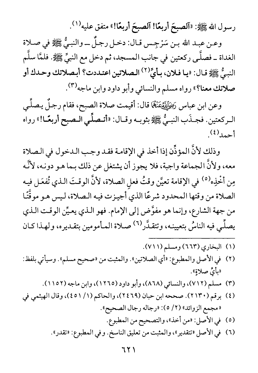 رسول الله - صلى الله عليه وسلم -: «آلصبحَ أربعًا! آلصبحَ أربعًا!» متفق عليه (¬١).