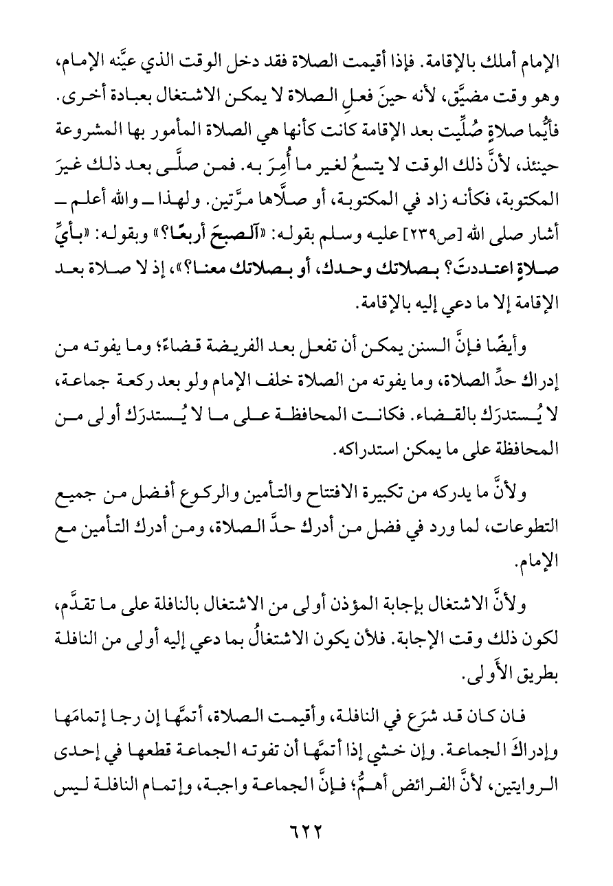 الإمام أملك بالإقامة. فإذا أقيمت الصلاة فقد دخل الوقت الذي عيَّنه الإمام، وهو وقت مضيَّق، لأنه حينَ فعلِ الصلاة لا يمكن الاشتغال بعبادة أخرى. فأيُّما صلاةٍ صُلِّيت بعد الإقامة كانت كأنها هي الصلاة المأمور بها المشروعة حينئذ، لأنَّ ذلك الوقت لا يتسعُ لغير ما أُمِرَ به. فمن صلَّى بعد ذلك غيرَ المكتوبة، فكأنه زاد في المكتوبة، أو صلَّاها مرَّتين. ولهذا ــ والله أعلم ــ أشار صلى الله [ص ٢٣٩] عليه وسلم بقوله: «آلصبحَ أربعًا؟» وبقوله: «بأيِّ صلاةٍ اعتددتَ؟ بصلاتك وحدك، أو بصلاتك معنا؟»، إذ لا صلاة بعد الإقامة إلا ما دعي إليه بالإقامة.