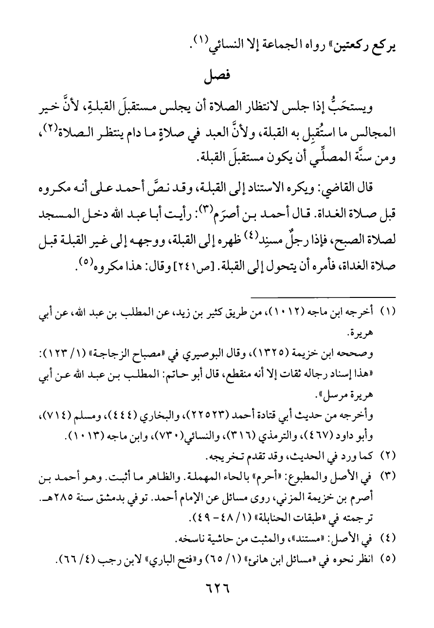 قال القاضي: ويكره الاستناد إلى القبلة، وقد نصَّ أحمد على أنه مكروه قبل صلاة الغداة. قال أحمد بن أصرَم (¬٣): رأيت أبا عبد الله دخل المسجد لصلاة الصبح، فإذا رجلٌ مسنِد (¬٤) ظهره إلى القبلة، ووجهه إلى غير القبلة قبل صلاة الغداة، فأمره أن يتحول إلى القبلة. [ص ٢٤١] وقال: هذا مكروه (¬٥).
