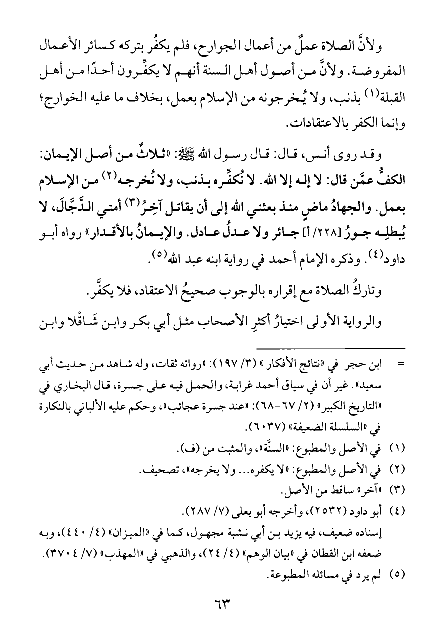ولأنَّ الصلاة عملٌ من أعمال الجوارح، فلم يكفُر بتركه كسائر الأعمال المفروضة. ولأنَّ من أصول أهل السنة أنهم لا يكفِّرون أحدًا من أهل القبلة (¬١) بذنب، ولا يُخرجونه من الإسلام بعمل، بخلاف ما عليه الخوارج؛ وإنما الكفر بالاعتقادات.