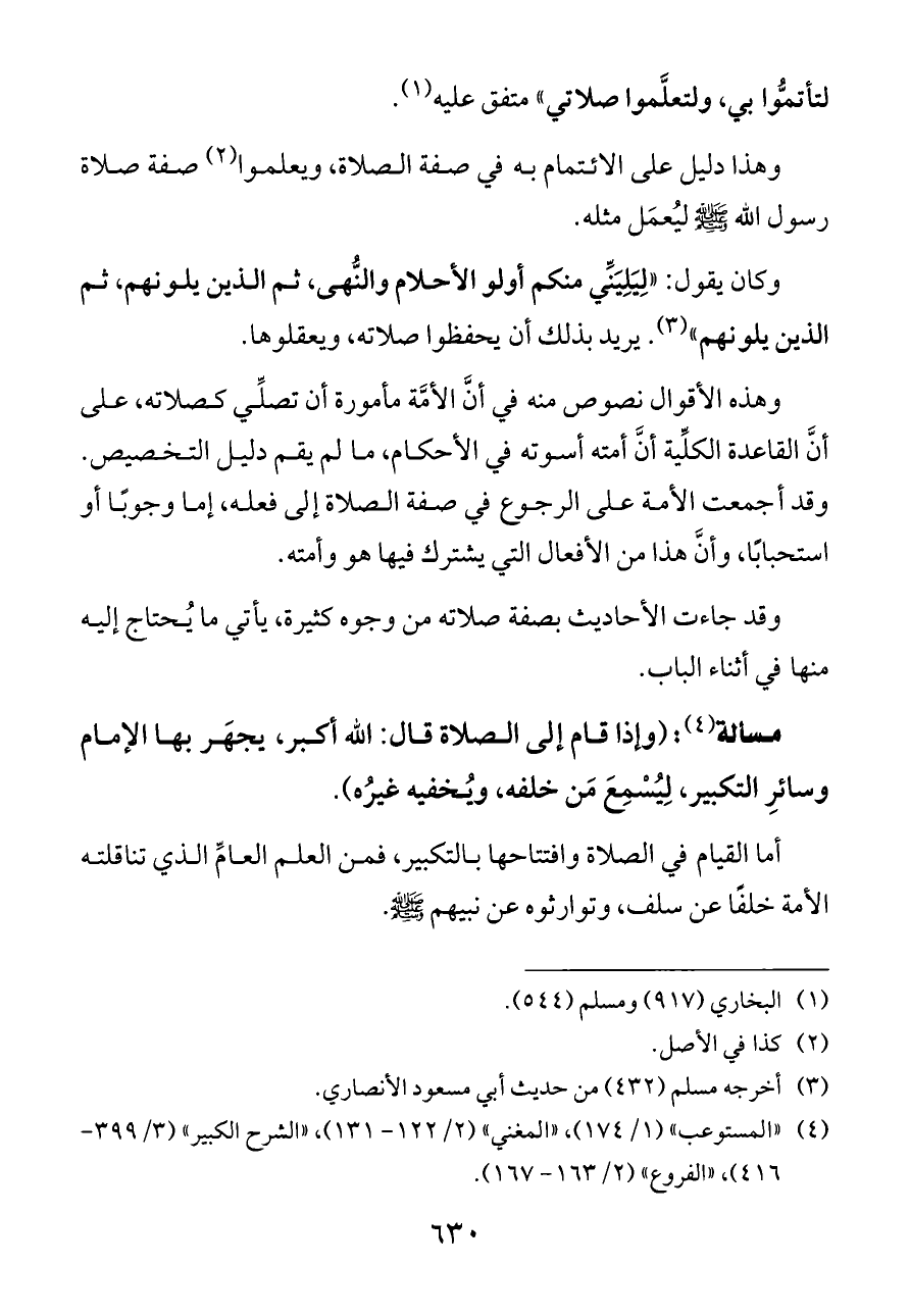وكان يقول: «لِيَلِيَنِّي منكم أولو الأحلام والنُّهى, ثم الذين يلونهم, ثم الذين يلونهم» (¬٣). يريد بذلك أن يحفظوا صلاته, ويعقلوها.